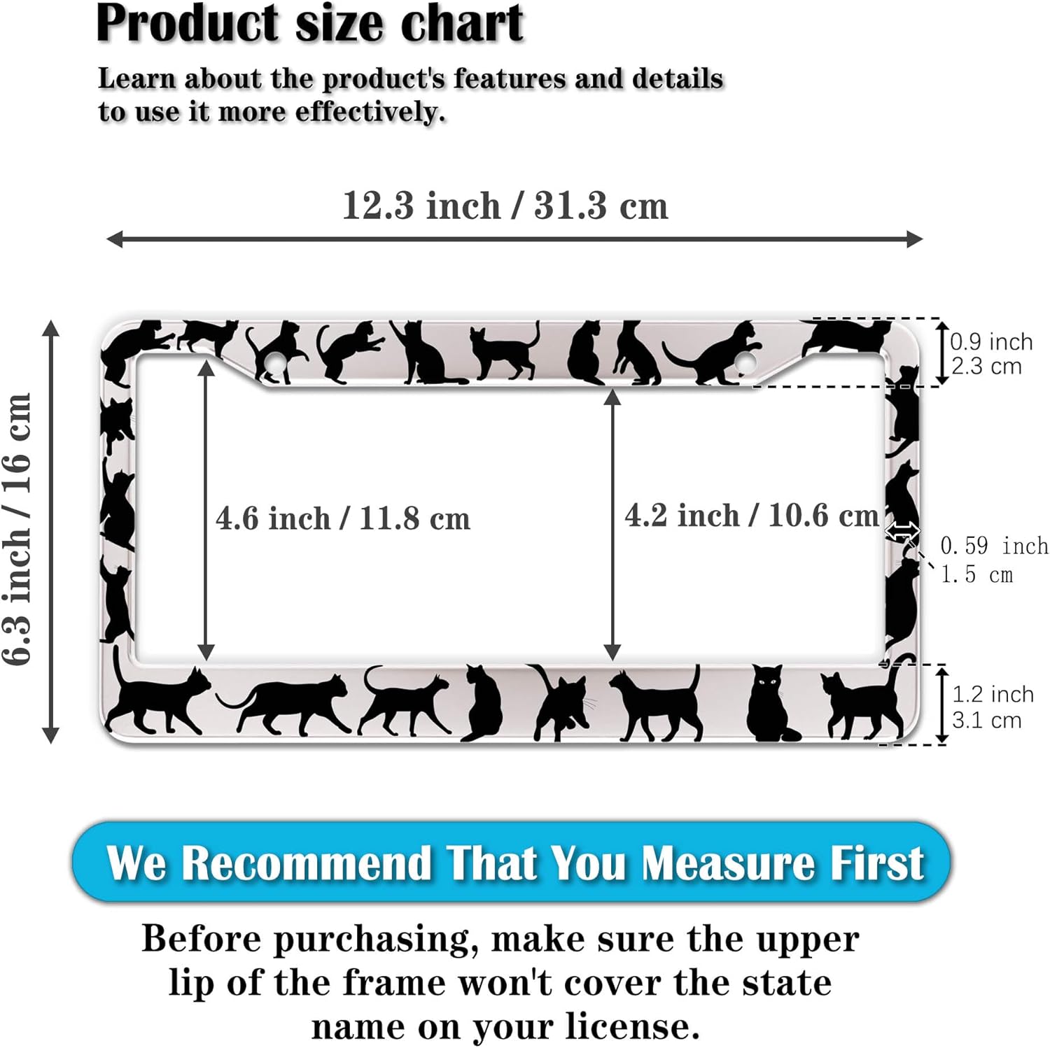 - STANDARD FRAME SIZE: Ensure a perfect fit by checking the dimensions to avoid covering your state name. These frames are specifically designed to fit standard American license plates measuring approximately 12.3" x 6.3" (16 x 31 cm). for most license plates in the U.S.