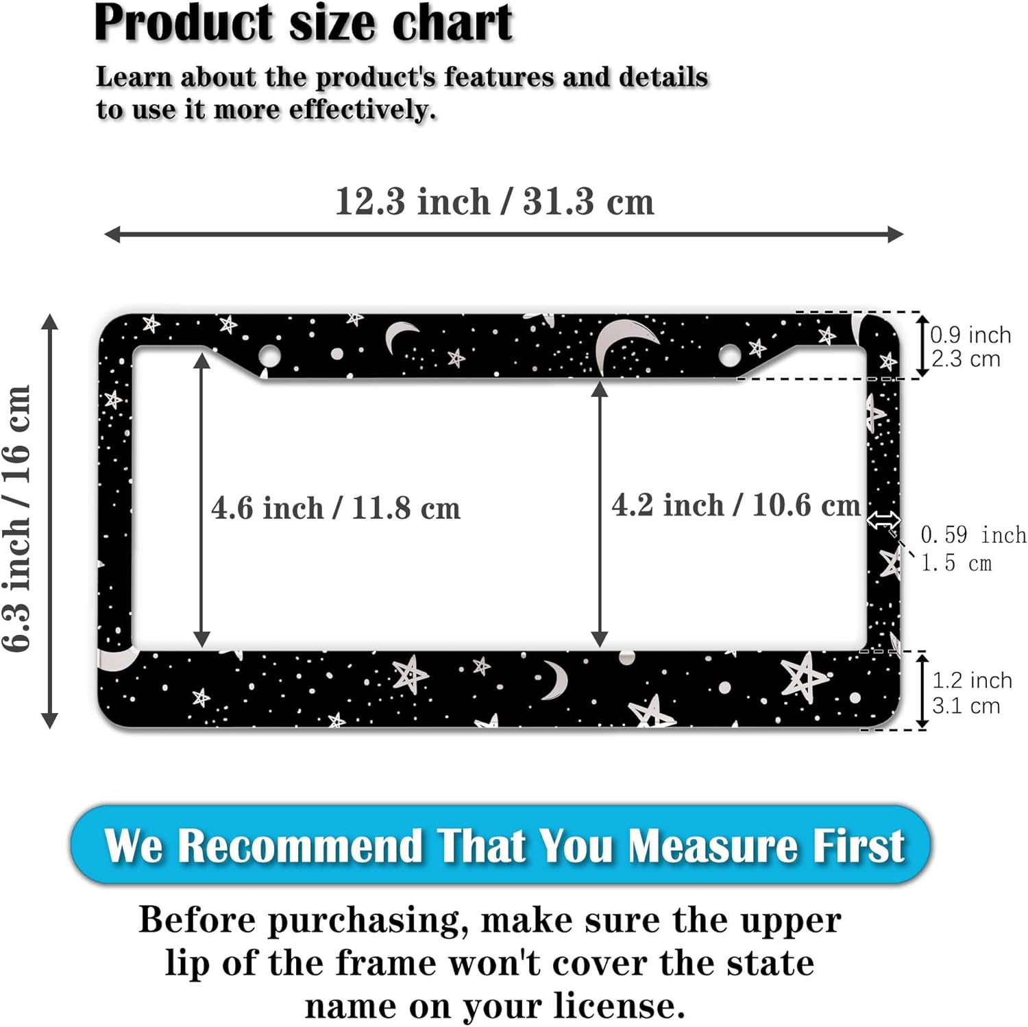 - STANDARD FRAME SIZE: Ensure a perfect fit by checking the dimensions to avoid covering your state name. These frames are specifically designed to fit standard American license plates measuring approximately 12.3" x 6.3" (16 x 31 cm). for most license plates in the U.S.