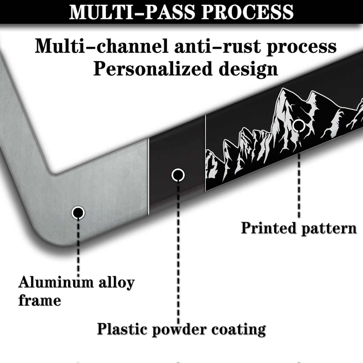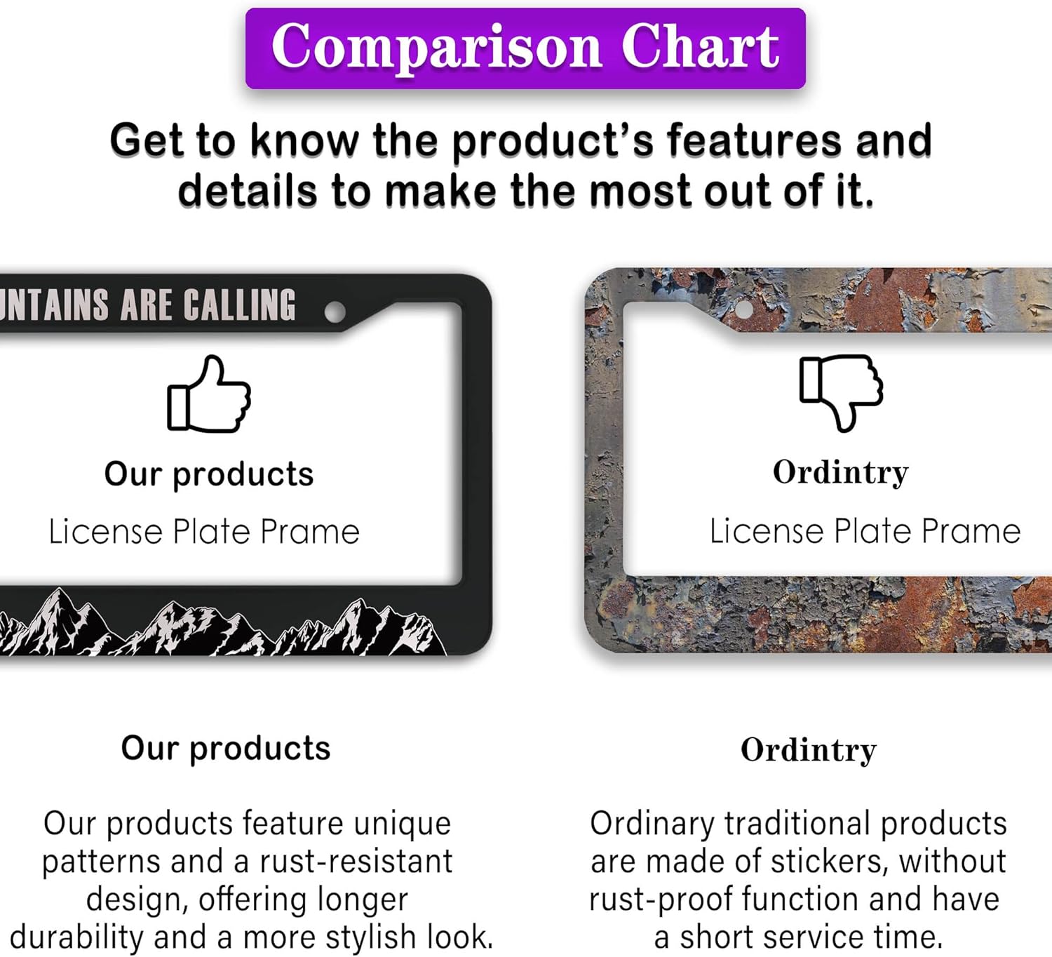 - ALUMINUM FRAME: This License Plate Frame is crafted from high-quality aluminum that is resistant to corrosion, rust, and harsh weather conditions. Its rugged reliability design ensures a long lifespan, making it capable of withstanding car washes and extreme weather, providing you with a reliable and stylish solution for your vehicle.