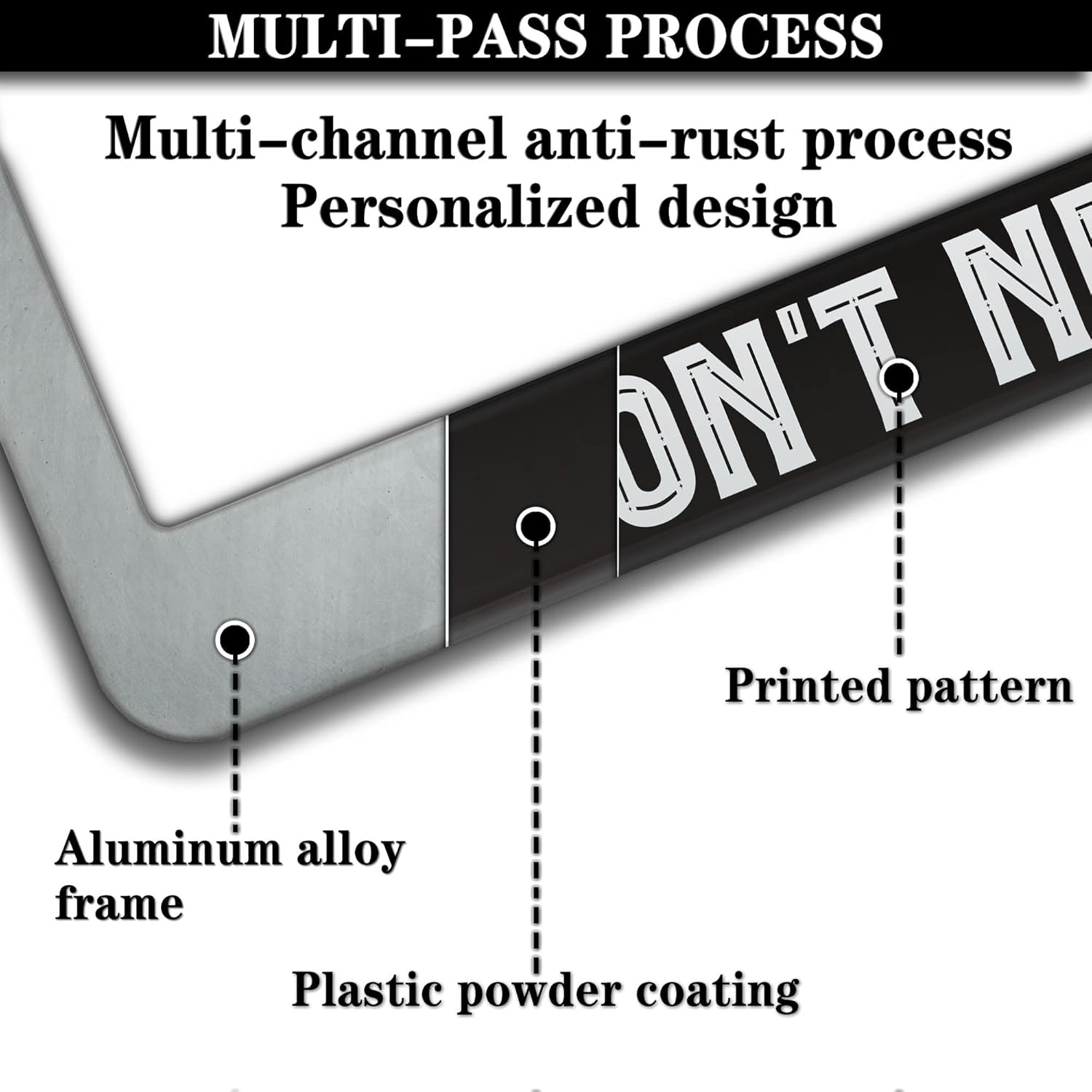 - ALUMINUM FRAME: This License Plate Frame is crafted from high-quality aluminum that is resistant to corrosion, rust, and harsh weather conditions. Its rugged reliability design ensures a long lifespan, making it capable of withstanding car washes and extreme weather, providing you with a reliable and stylish solution for your vehicle.