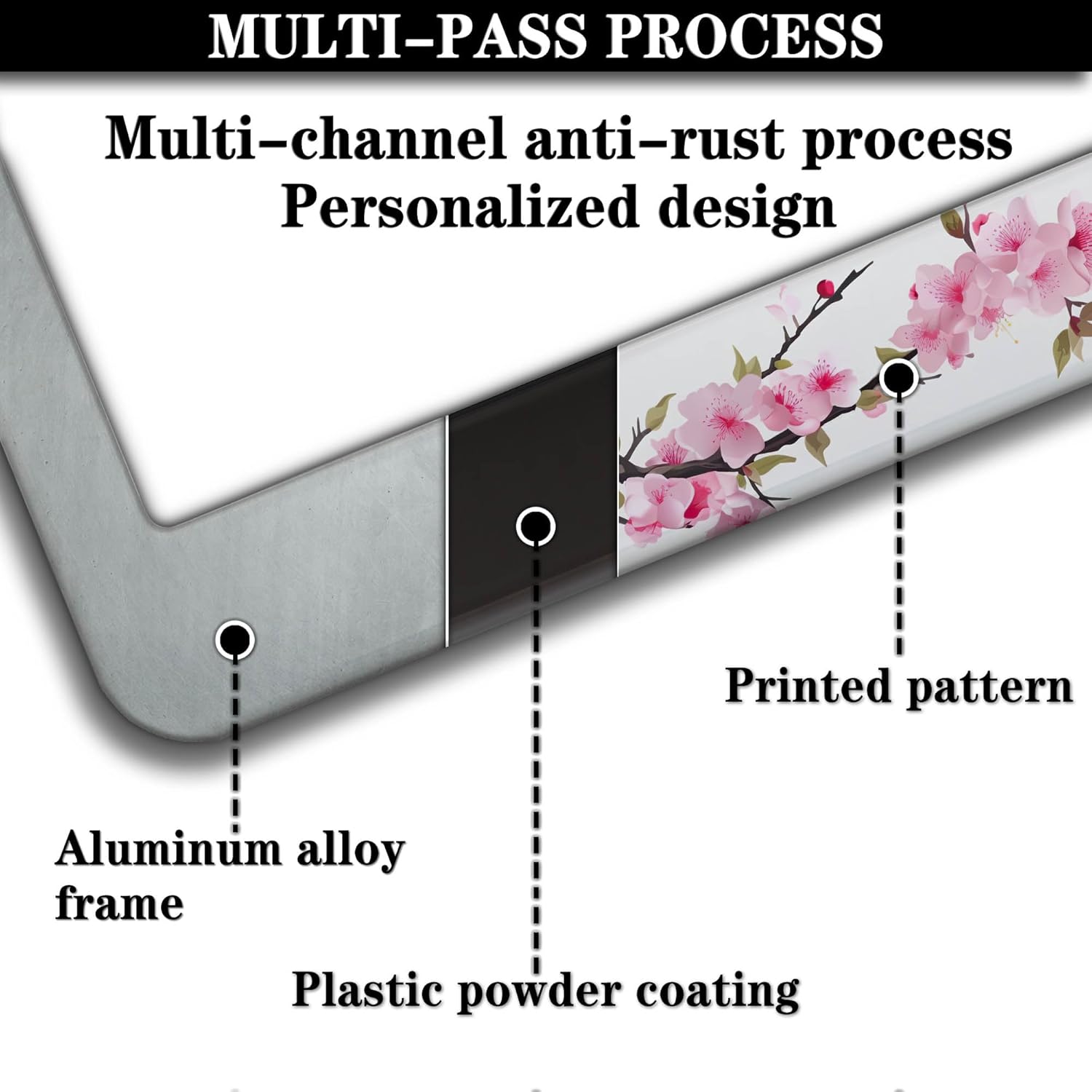 License Plate Frames for Men Powder License Plate Frame for Women Beautiful Cherry Blossom Aluminum Metal Car Accessory 2 Pack with Screw Covers Set