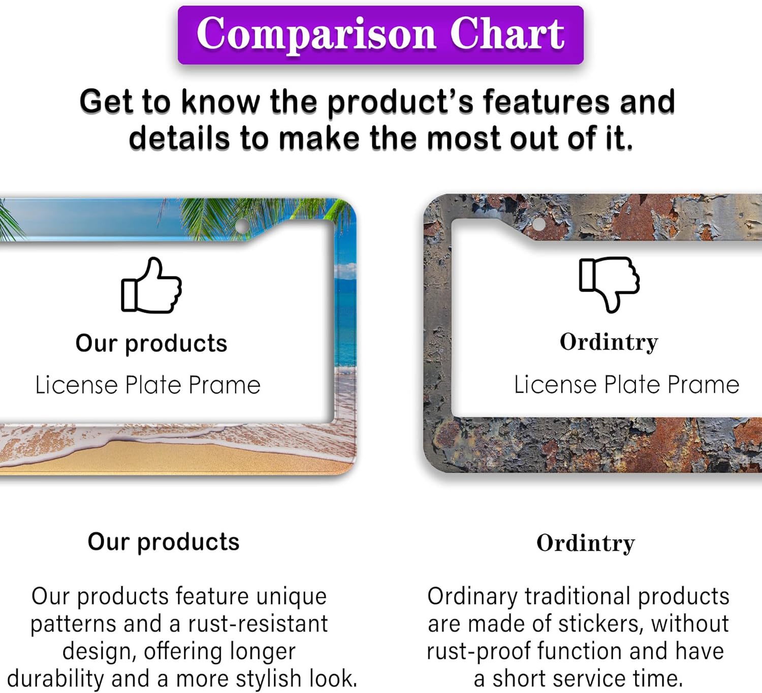 - ALUMINUM FRAME: This License Plate Frame is crafted from high-quality aluminum that is resistant to corrosion, rust, and harsh weather conditions. Its rugged reliability design ensures a long lifespan, making it capable of withstanding car washes and extreme weather, providing you with a reliable and stylish solution for your vehicle.