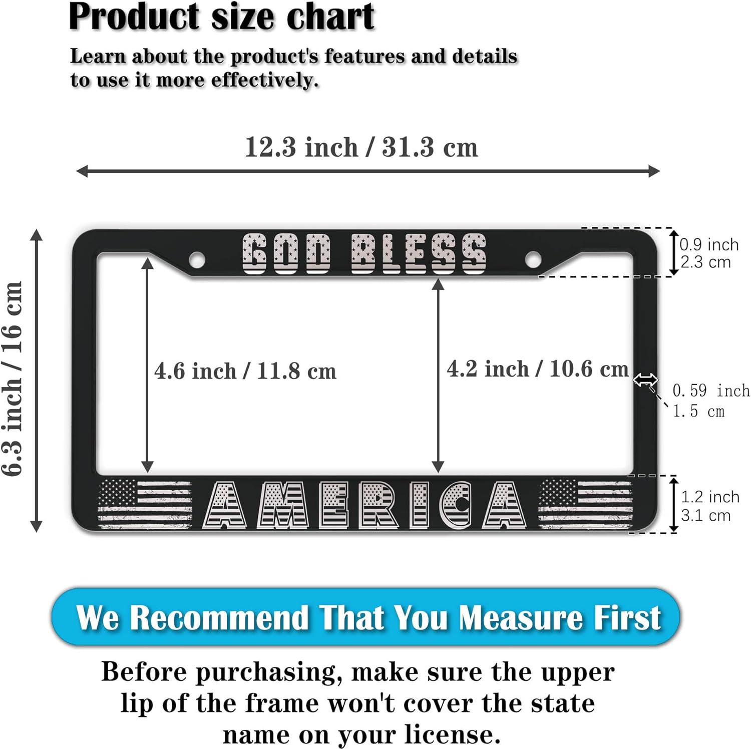 - STANDARD FRAME SIZE: Ensure a perfect fit by checking the dimensions to avoid covering your state name. These frames are specifically designed to fit standard American license plates measuring approximately 12.3" x 6.3" (16 x 31 cm). for most license plates in the U.S.