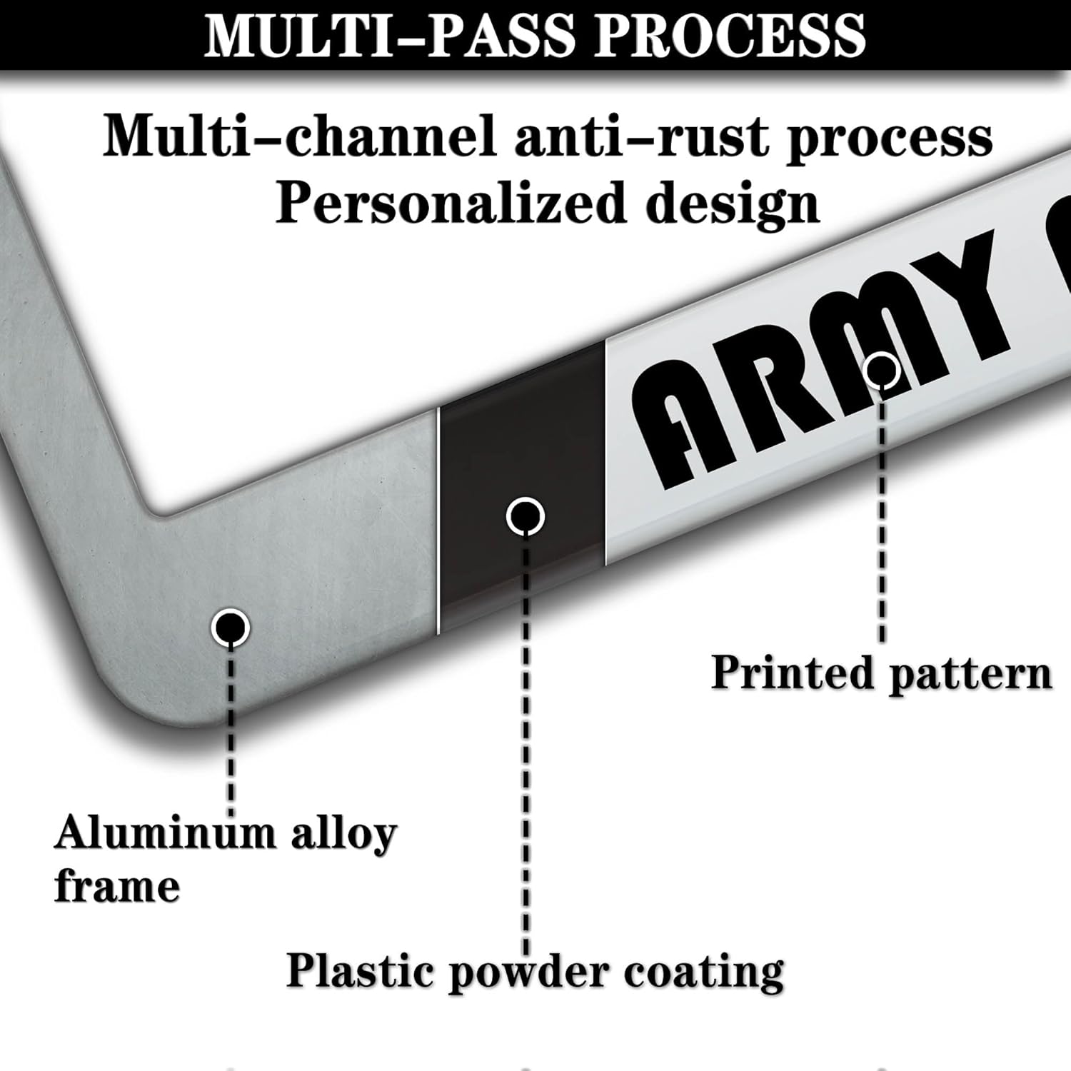 - ALUMINUM FRAME: This License Plate Frame is crafted from high-quality aluminum that is resistant to corrosion, rust, and harsh weather conditions. Its rugged reliability design ensures a long lifespan, making it capable of withstanding car washes and extreme weather, providing you with a reliable and stylish solution for your vehicle.
