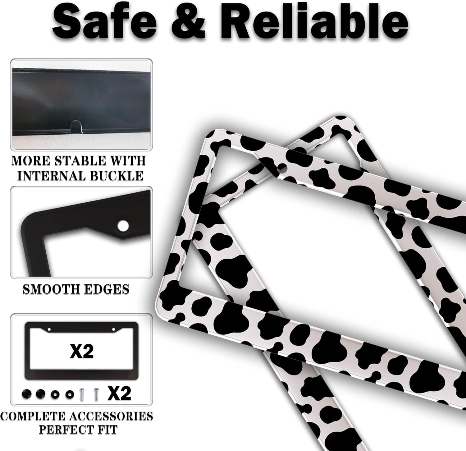 License Plate Frames Black and White License Plate Frame Animal Cow Print White Black Spot Design Universal Aluminum Car Accessory 2 Pack with Screw Covers Set