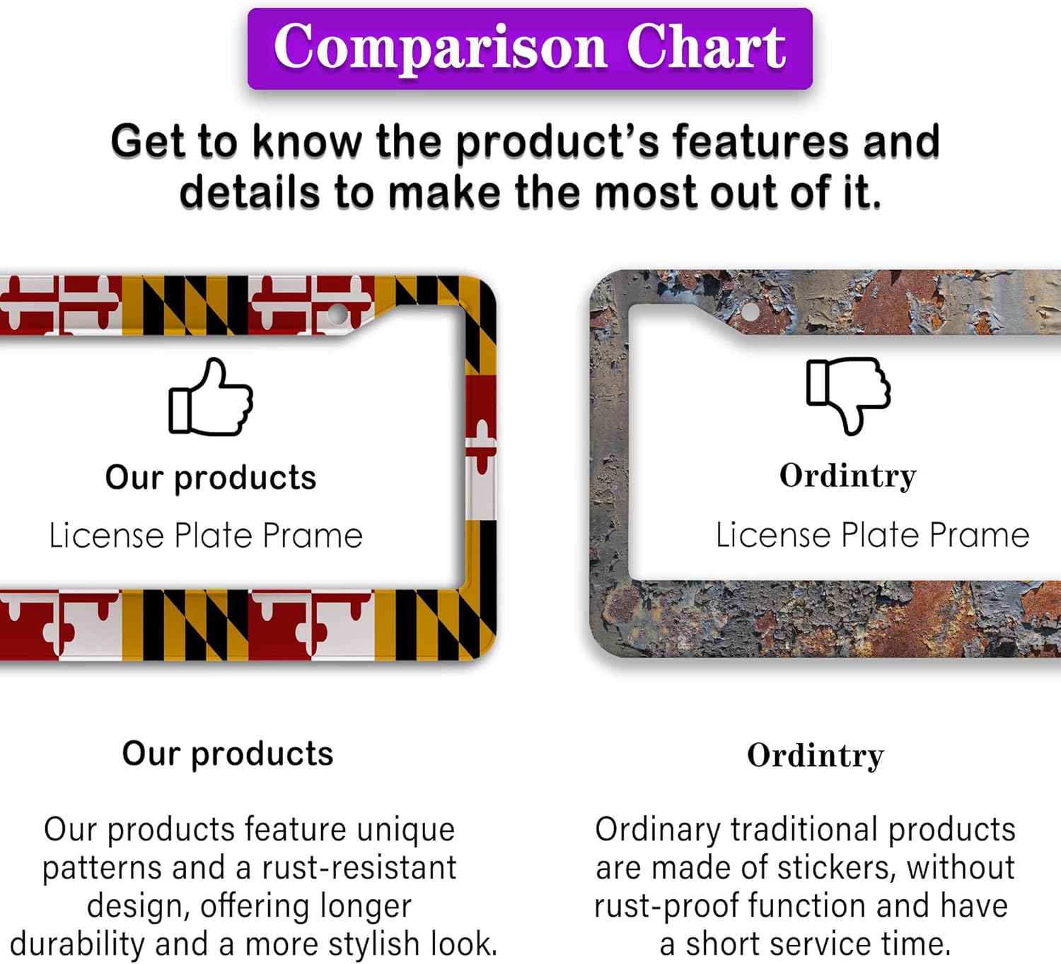 - ALUMINUM FRAME: This License Plate Frame is crafted from high-quality aluminum that is resistant to corrosion, rust, and harsh weather conditions. Its rugged reliability design ensures a long lifespan, making it capable of withstanding car washes and extreme weather, providing you with a reliable and stylish solution for your vehicle.