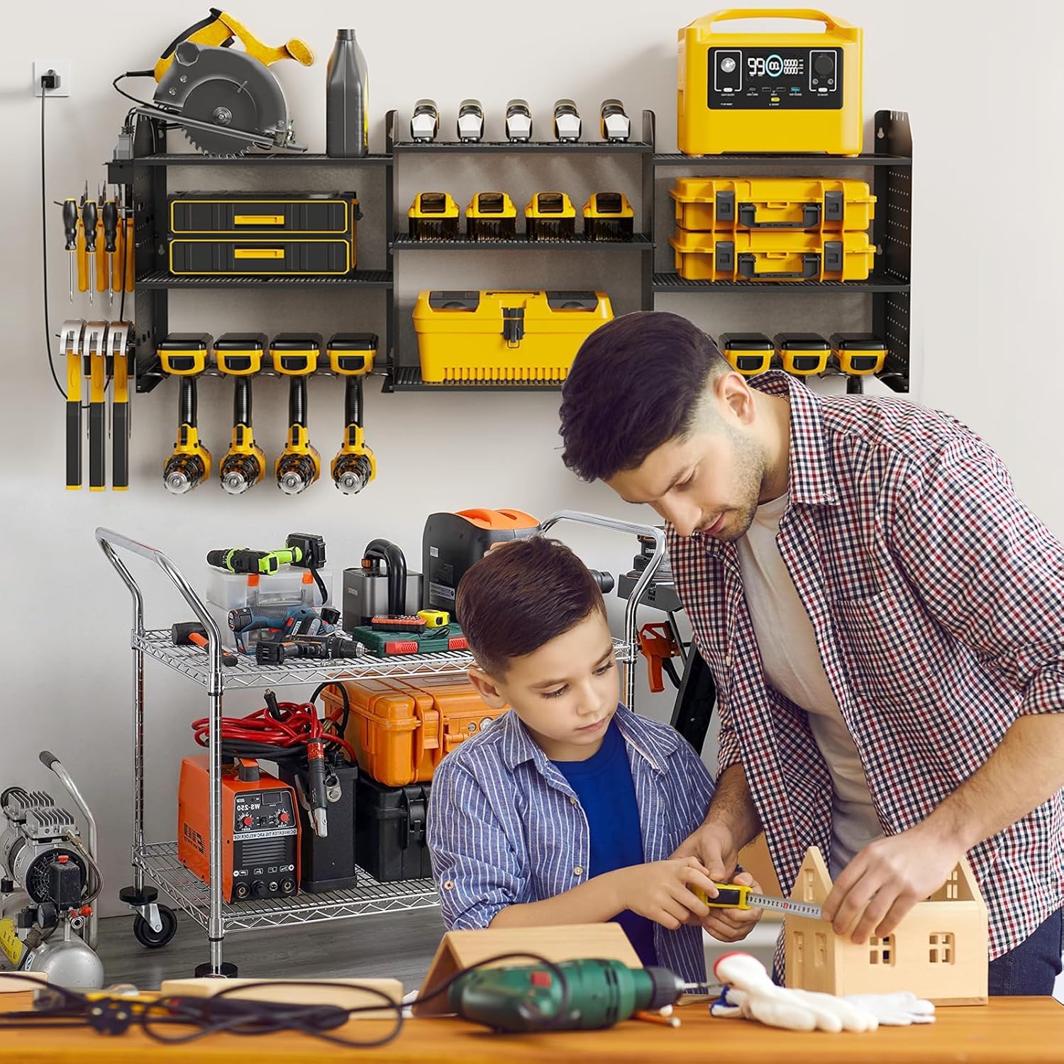 - Expanded Width to Maximized Storage: The Xankzi power tool organizer wall mount with charging station features a patented wide design in its 2 central shelves, perfect for storing more tools, especially longer items like chainsaws. Measuring 45.6" wide, 16.5" high, and 8.7" deep, this sturdy and space-efficient power tool storage rack keeps your tools organized