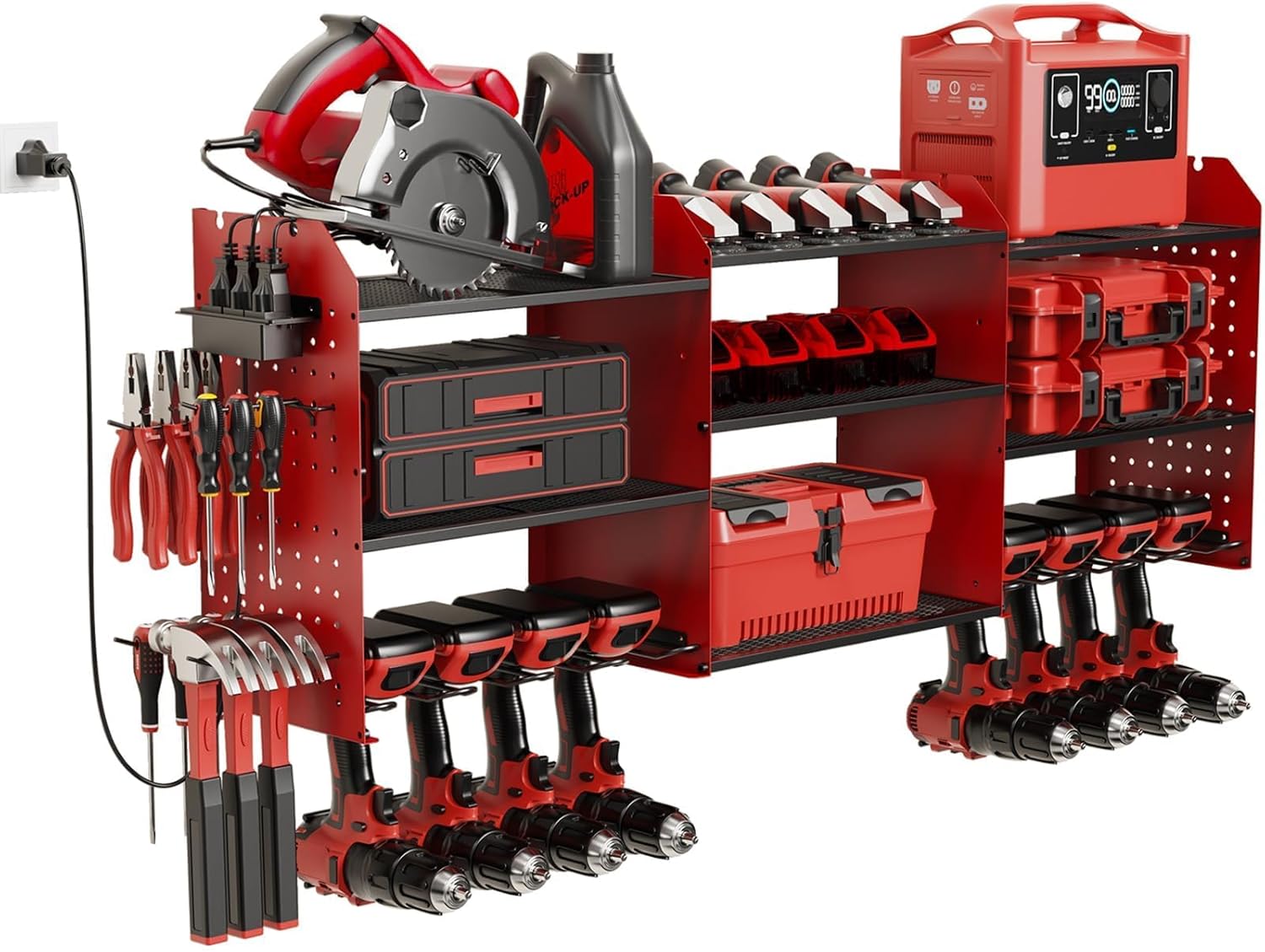 Power Tool Organizer with Charging Station Wall Mount, 3 Layer Expanded Heavy Duty Garage Organization, 45.5 Inch Length Garage Tool Storage, 8 Drills, 2 Assemble Method, Red