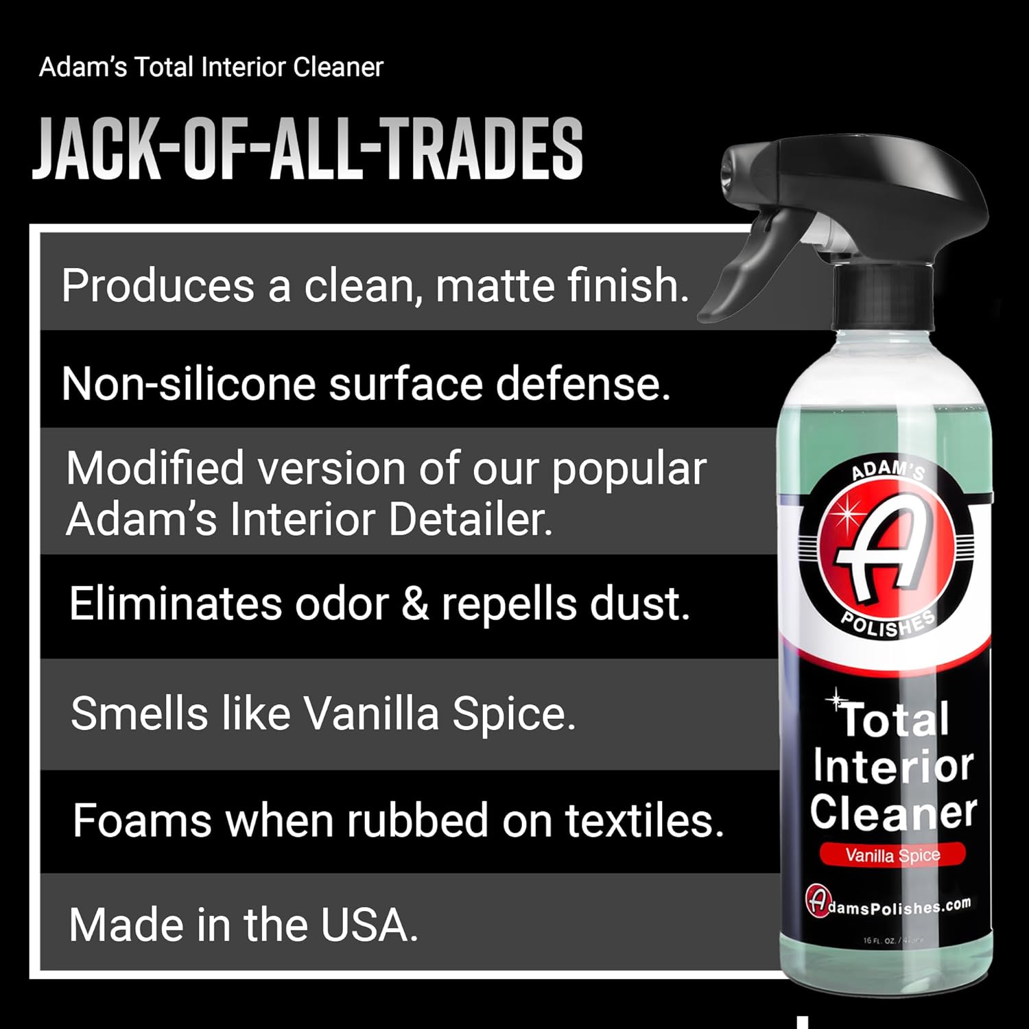 Adam's Polishes Total Interior Cleaner & Protectant, Quick Detailer & SiO2 Protection, Ceramic Infused, Anti-Static, OEM Finish, For Leather, Vinyl, Plastics, Glass & More