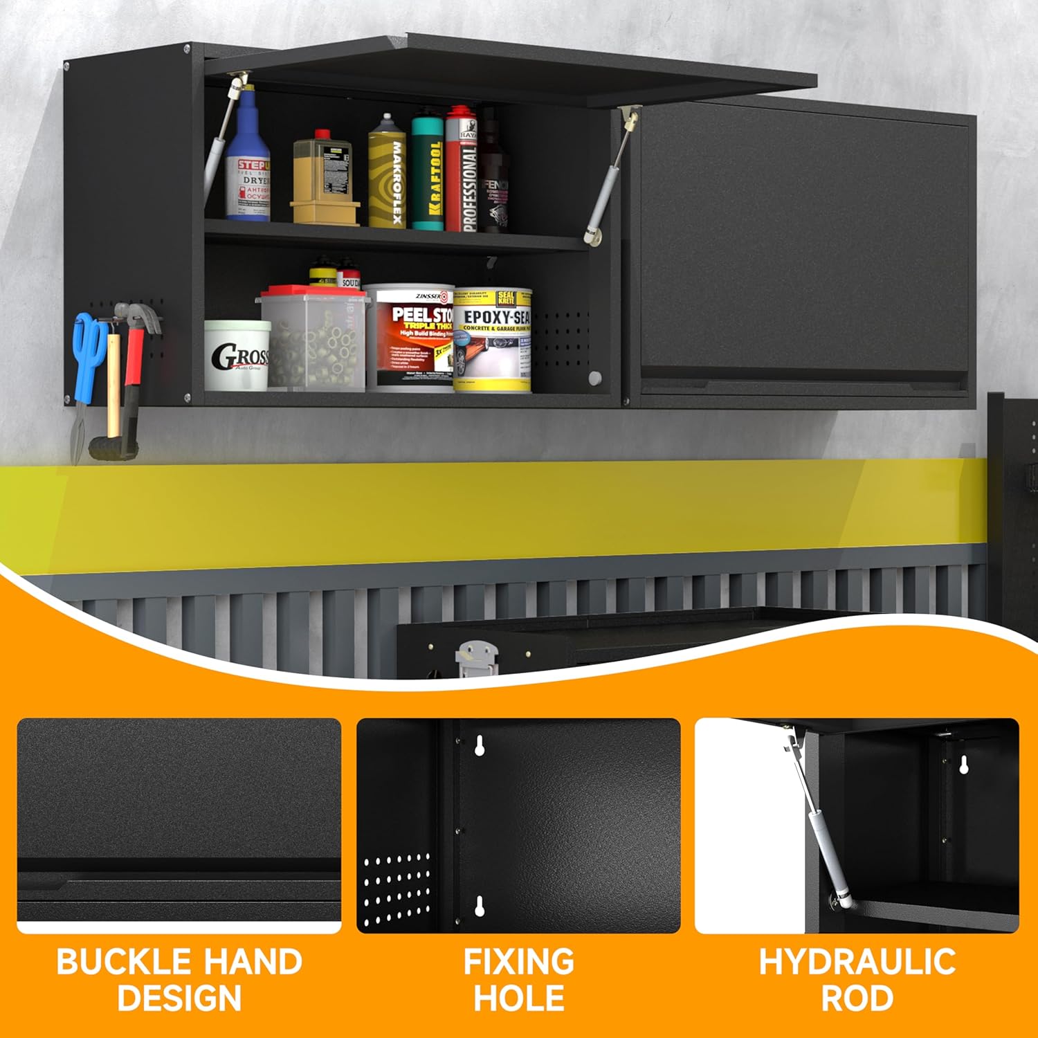 - 🌈【HYDRAULIC-OPENING DOOR】The door of the floating garage tool cabinet has a hydraulic lever with an upward opening design that opens and closes at an angle of 90 degrees, the hydraulic-rod to keep the door up so that free your hands while you put in or take out items. Each corner features a mounting hole, allowing this wall storage cabinet to be firmly fixed to the wall without any risk of falling.