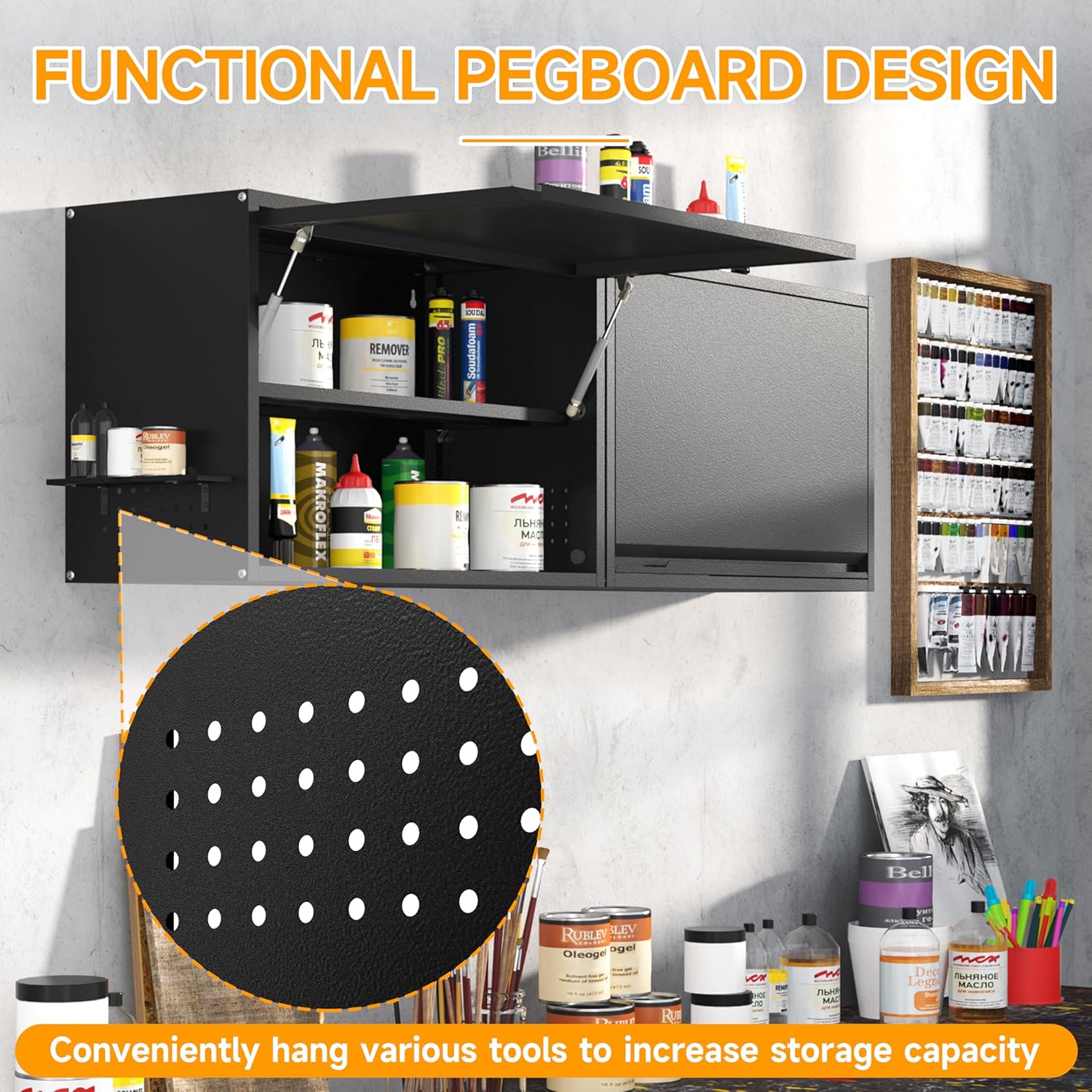 Metal Wall Cabinet with Up-flip Door,Metal Wall Storage Cabinet with Adjustable Shelf,Wall Mounted Tool Cabinets with Pegboard for Garage,Basement,Home Office, Kitchen,Warehouse-Black