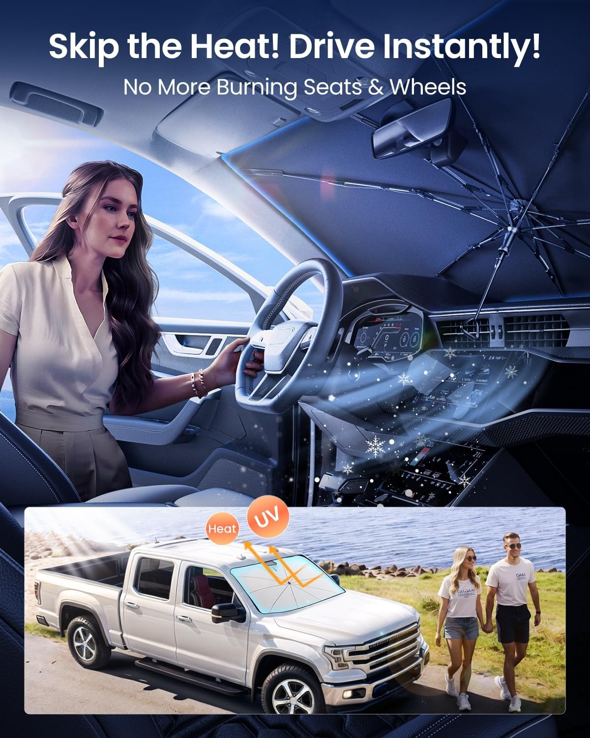 REEVAA 2025 Upgraded Car Windshield Sun Shade Umbrella [100% Sun Protection & Keep Cool] Protect Interior, 360° Flex Handle Sun Shield Sunshade, Large (61 * 33.5 in) for Large Truck