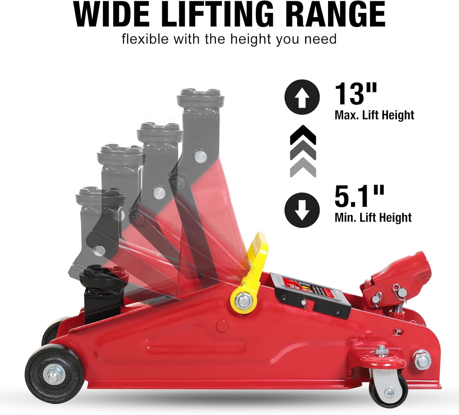 - SPEEDY LIFT GARAGE JACK - This Hydraulic Trolley Jack features a 2 ton (4,000 lb) capacity with a min lifting height of 5.1" and a max height of 13". Allows you to easily lift the jack up to desired height, ideal for most cars, not recommended for SUVs and trucks