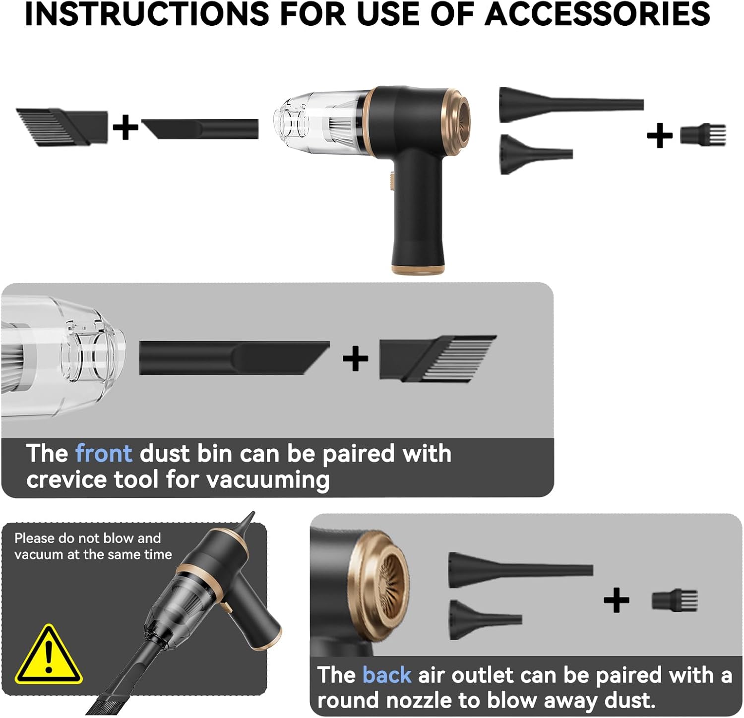 - MULTI-NOZZLES & FINE CLEANING:Crevice Tool access difficult to reach areas such as between sofa cushions and used to vacuum in narrow, irregular crevices in furniture, car interiors, small edges, and more. The portable car vacuum is also equipped with various detachable brush head nozzle accessories, which are very suitable for helping you deeply clean cars, keyboards, cameras, electronics, air conditioning, sofas, windows, pets, plants, etc., or for inflation