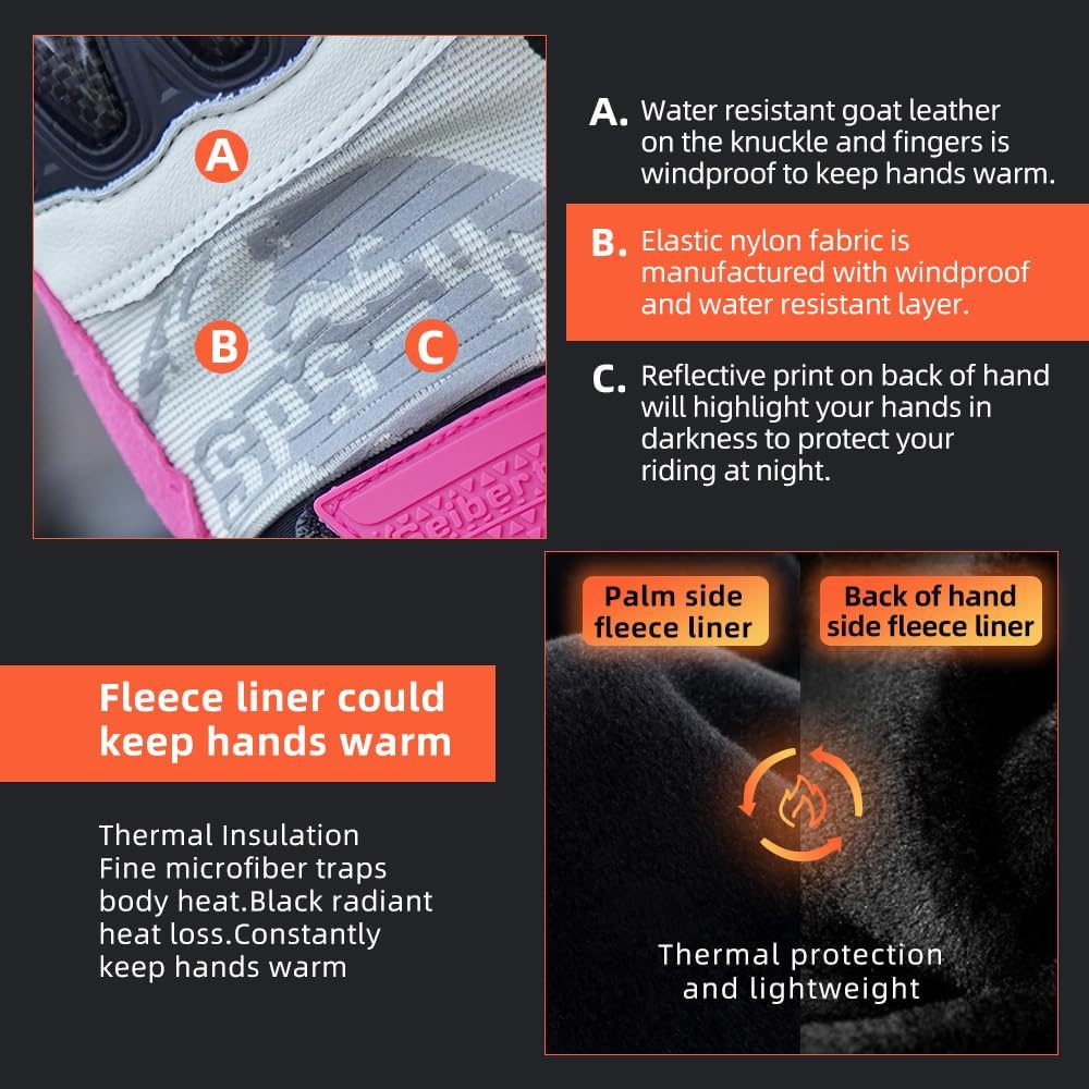 - Carbon fibre on knuckle, lower palm and extended wrist;Stretch zone on fingers ensures wearing comfort and dexterity; Wiper blade on side of forefinger;Leather touchscreen sensitive on both index finger tips and thumb bellies;Super grip print on the finger-reinforced padding and thumb crotch part;