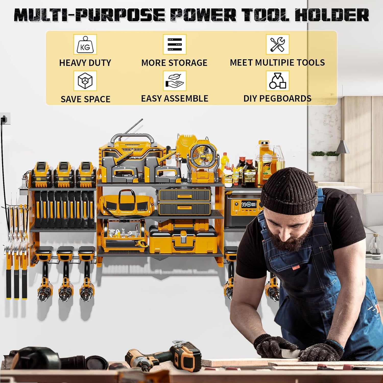 - 【EXCELLENT MATERIAL】Our power tool organizer is constructed with high-quality, heavy-duty steel metal and has a black powder coat finish to prevent rust. It withstands various environments, ensuring long-lasting use in wet basements or dusty garages.