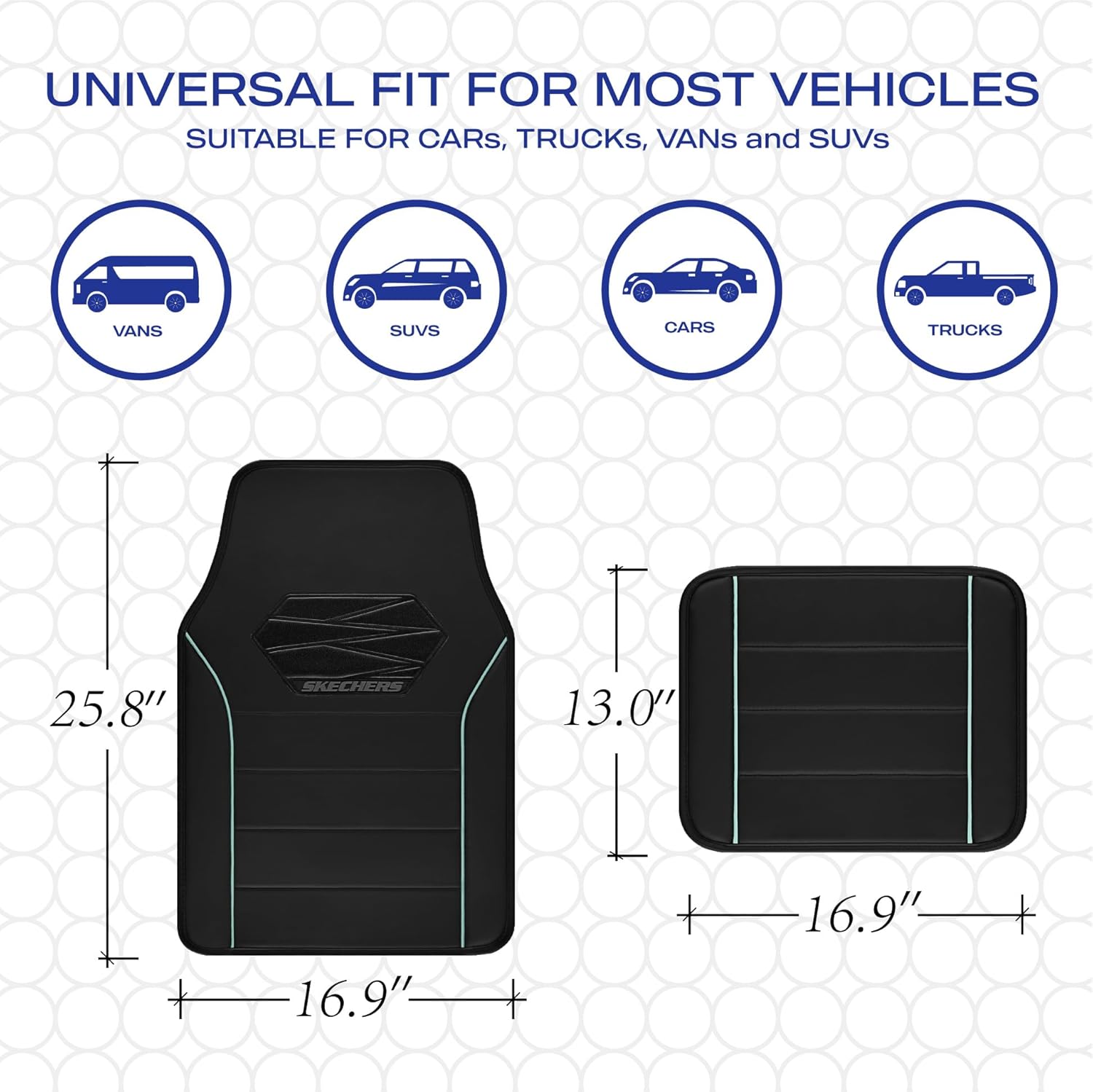 - UNIVERSAL FIT-Skechers car mats Designed to fit most SUVs,vans,sedans,and trucks, This full set includes 4 floor mats,Front piece: 25.8 × 16.9 inches,Back piece: 13× 16.9 inches, providing comprehensive coverage for both front and rear seats, giving your entire vehicle floor the protection it needs.Perfect gift for family, relatives and friends