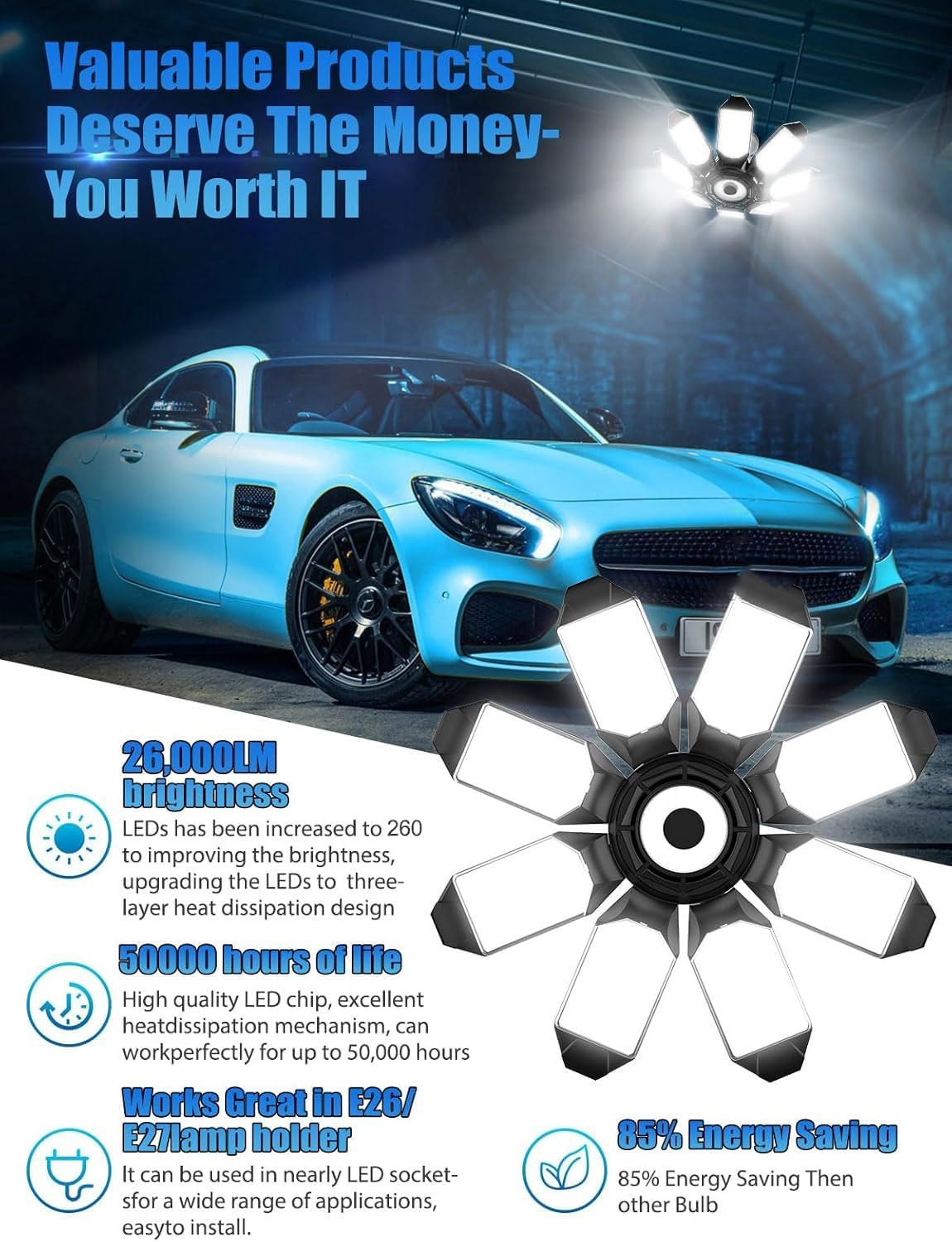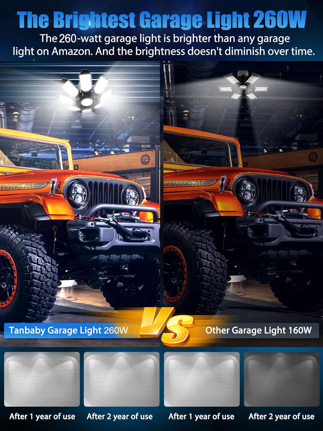 TANBABY 260W LED Garage Lights 2 Pack, Total 52000LM Deformable Best Ceiling Light with 8+1 Panels, E26/E27 Screw in Bulbs for Basement, Attic