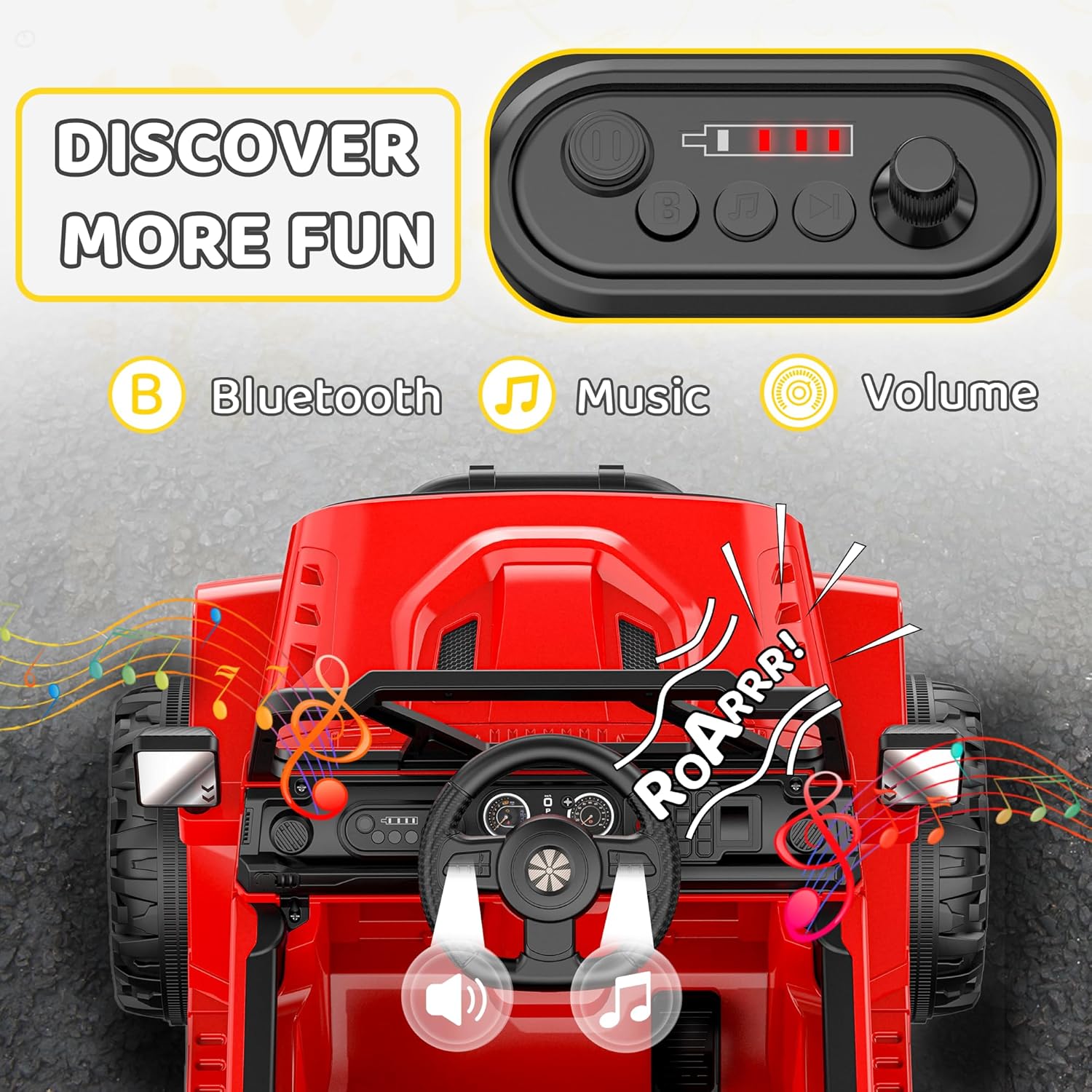 - Fun & Easy to Operate: This kids ride on truck car is equipped with MP3 player that supports wireless connection to your phone. Except for the pre-programed songs, you can also play your little onesβ favorite music while cruising. Unlike those traditional music panels, this one has big buttons that are super user-friendly for little hands to operate, rotary knob for volume adjustment, and easy-to-read battery level bar from the screen