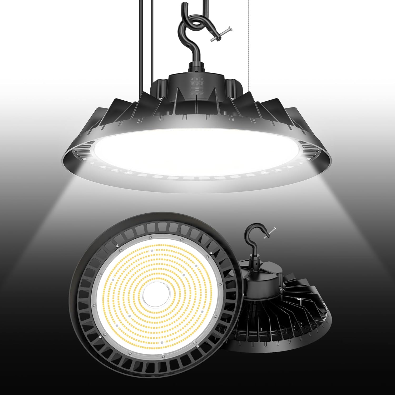 - 1 Minute Installation: This high bay ceiling light includes the 5ft cable, US ground 3-prong plug, safety rope and hook, you just need 3 steps to install it. First, hang it in the ceiling hook, Then connect the safety rope, at last plug it in to an outlet, it is perfect for you to solve your problem such as short cable, unsafe etc