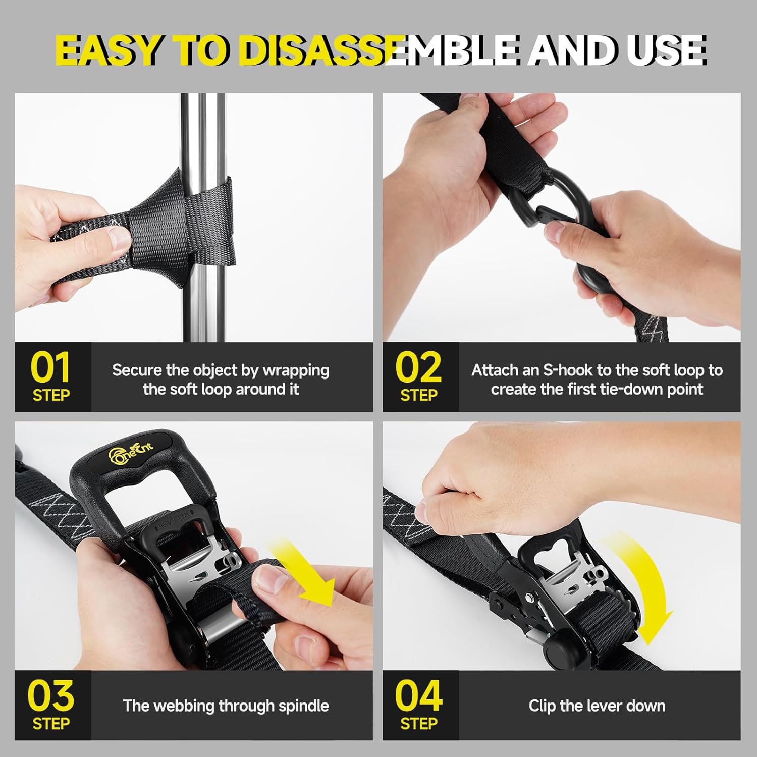 - Versatile Applications : Our tie-down straps are perfect for securing motorcycles, ATVs, UTVs, boats, kayaks, paddleboards, large appliances, and luggage for any transportation need. Whether you’re on the road or at home, these straps are your go-to solution!