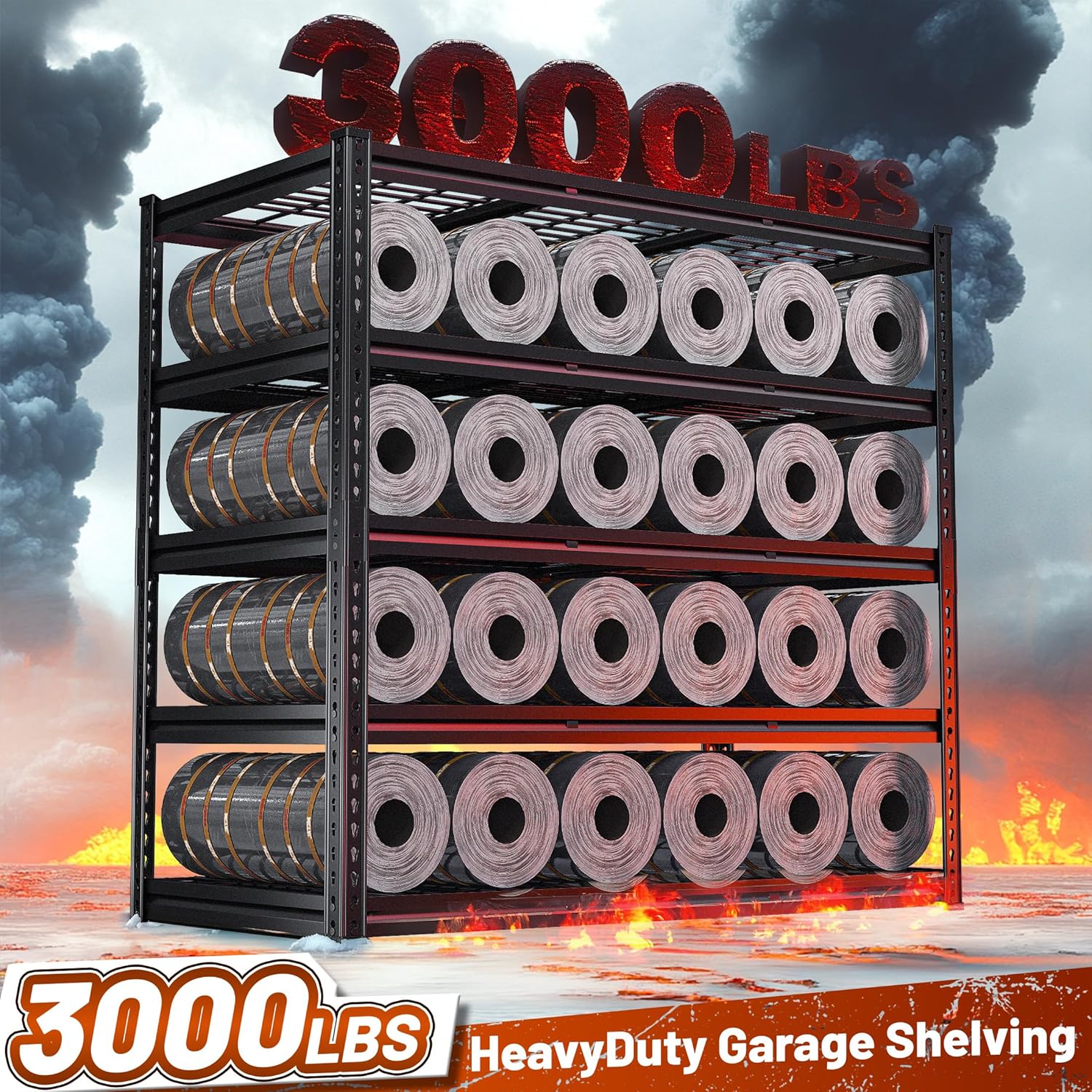 - ă3000LBS Garage Shelving Heavy DutyăThe metal shelving adopts thickened double-layer columns, and the heavy duty shelving is made of sound metal material. Each layer of shelves has 4 double layers of steel wire and 2 additional braces, thickened metal columns and beams provide greater support to prevent this garage shelves from deformation and bend. Each sturdy shelf layer can hold up to 600 LBS for a total carrying capacity of 3000 LBS