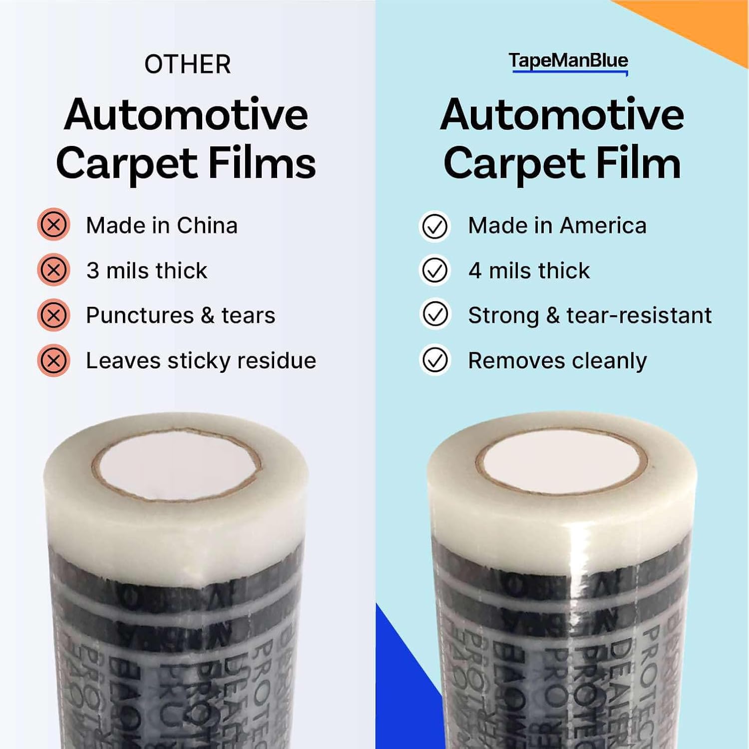 - AMERICAN MADE: Made 100% in the United States, this carpet protector for cars is of the highest quality. While many brands will import their dealer plastic mats and other materials to save a quick buck, TapeManBlue is dedicated to going the extra mile to provide quality floor covers for cars. Investing in our American-made floor mats for cars plastic sheets ensures top-notch quality for your projects.