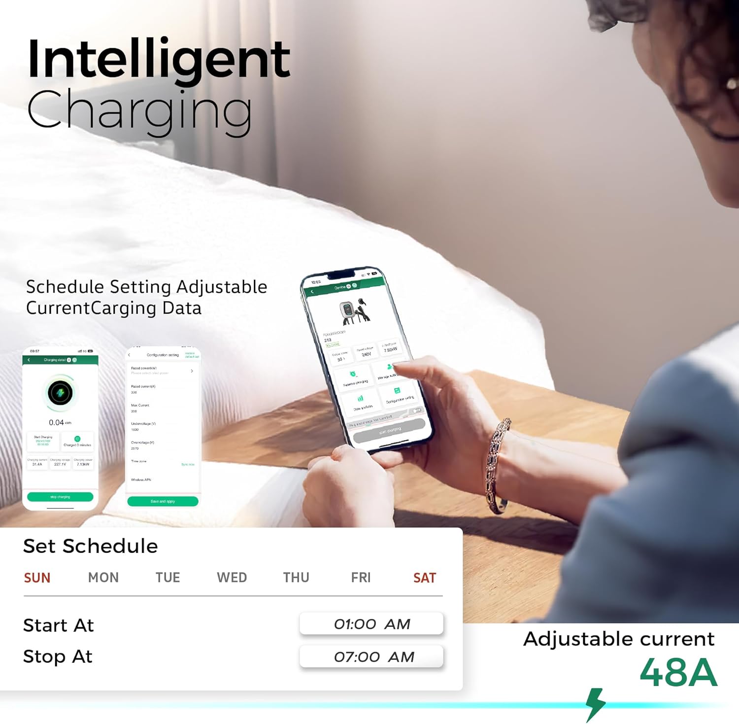 - Charging Smart APP: With the new user friendly Charging App, you can connect with the level 2 charger via wifi or Bluetooth to set the charging time during off-peak rates, set up the charging current, get data and charging info. Enjoy the schedule charging from the TESSAN EV Charger Level 2