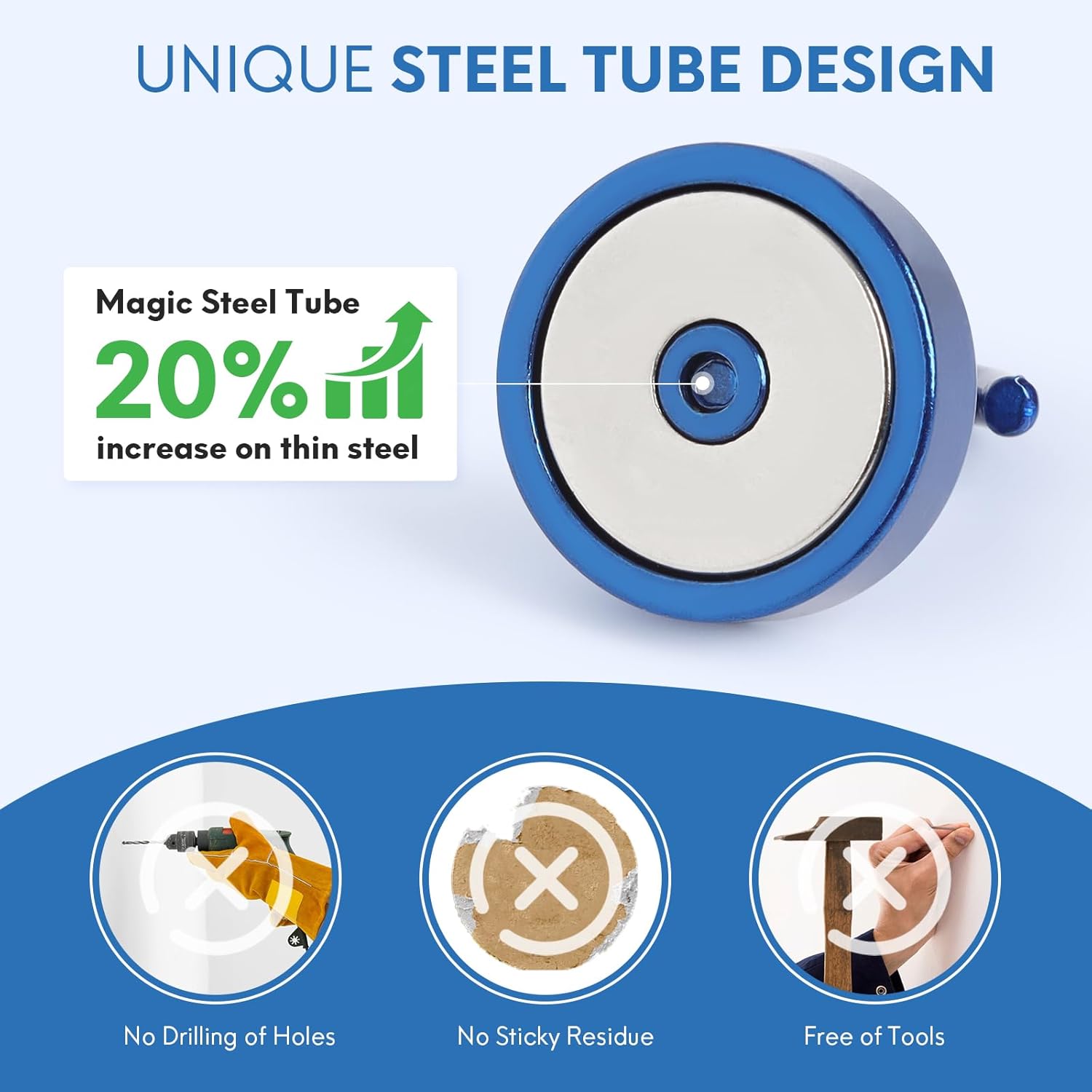 - ✔MAGIC STEEL TUBE DESIGN - Unique design of steel tube inside the base of magnetic hooks greatly increases the attractive force , especially on thin steel! It increase approximately 20% force comparing those none-tube magnets. it solves the problem of weak force on thin steel. Permanent magnetic hook with magic steel tube, strong magnetism lasts forever!