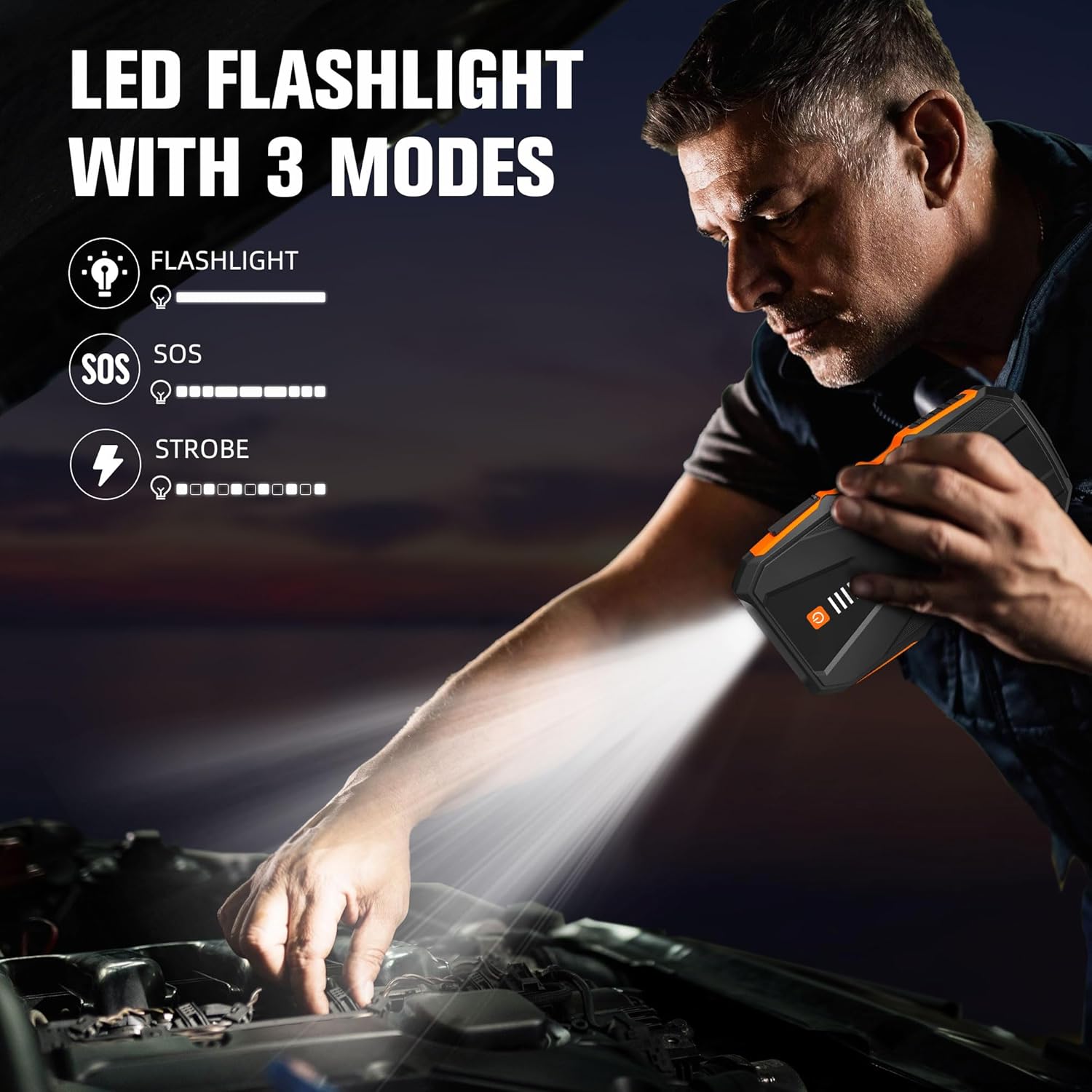 - ăADVANCED PROTECTION SYSTEMăThe jump box for car battery adopts an efficient battery management system (BMS), with spark protection, reverse polarity protection, low-temperature protection, high-temperature protection, overload protection, and more than 8 multiple protections, which can quickly and safely start a dead car battery even in extreme temperatures (-4°F~140°F)