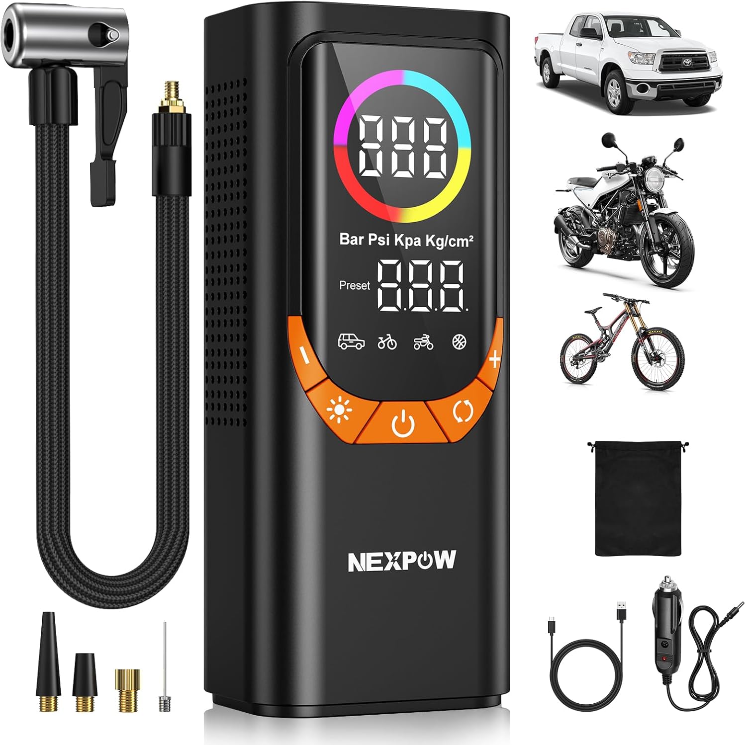 - EASY TO USE & AUTO SHUT-OFF: With 4 preset inflation modes and a custom mode, the NEXPOW car air pump is easy to use even for a new beginner. The large digital display helps you read the tire pressure just at a glance. Besides, the auto shut-off function ensures the inflator stops once the preset pressure is reached, preventing over-inflation and delivering precise results every time. Just set it and let it do the work!