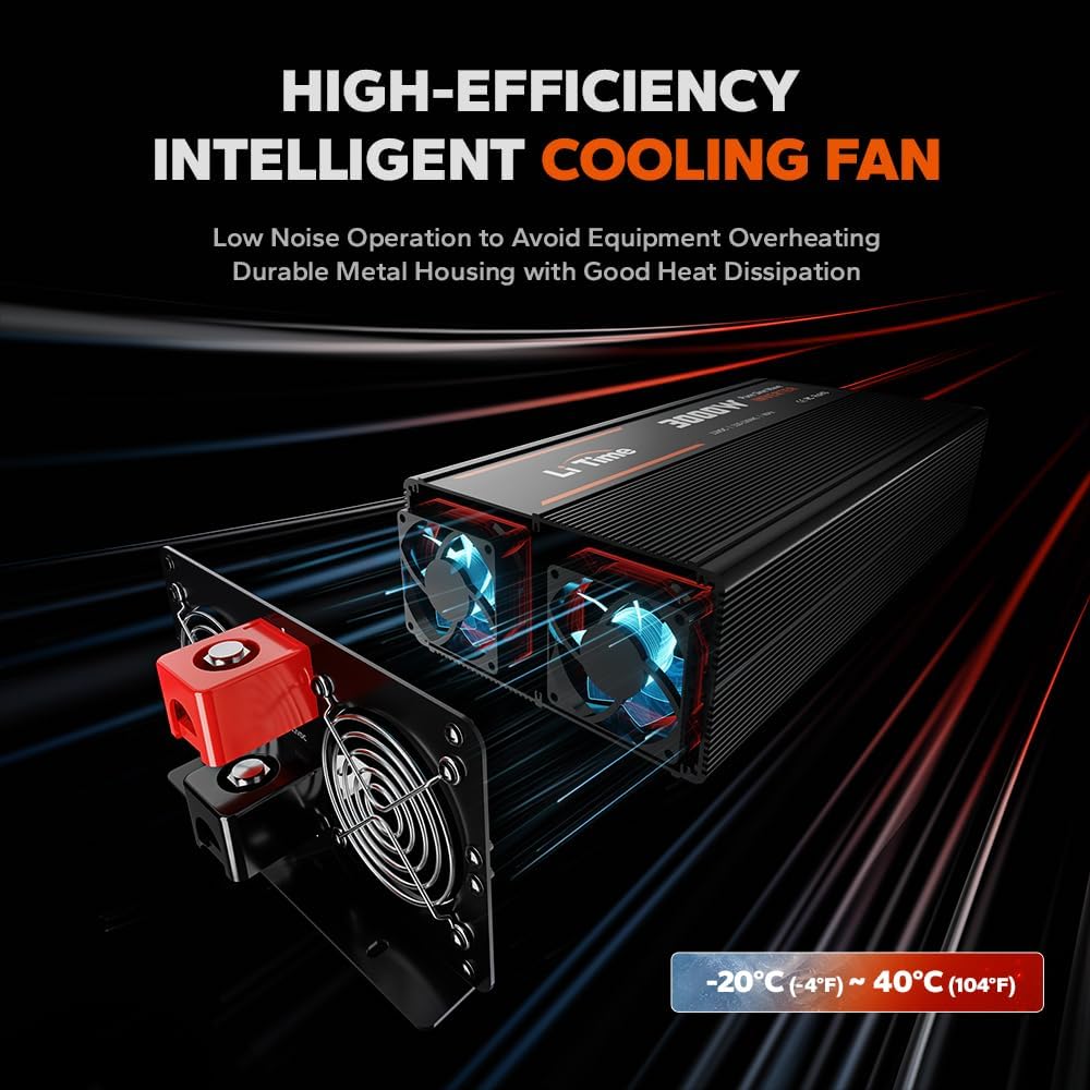 - High Output Power: LiTime 3000W inverter converts 12V DC to 110-120V AC power efficiently with a 6000W surge for clean and stable operation. Whether youβre powering heavy-duty equipment or multiple devices simultaneously, the LiTime inverter is designed to meet your energy needs with ease and reliability.