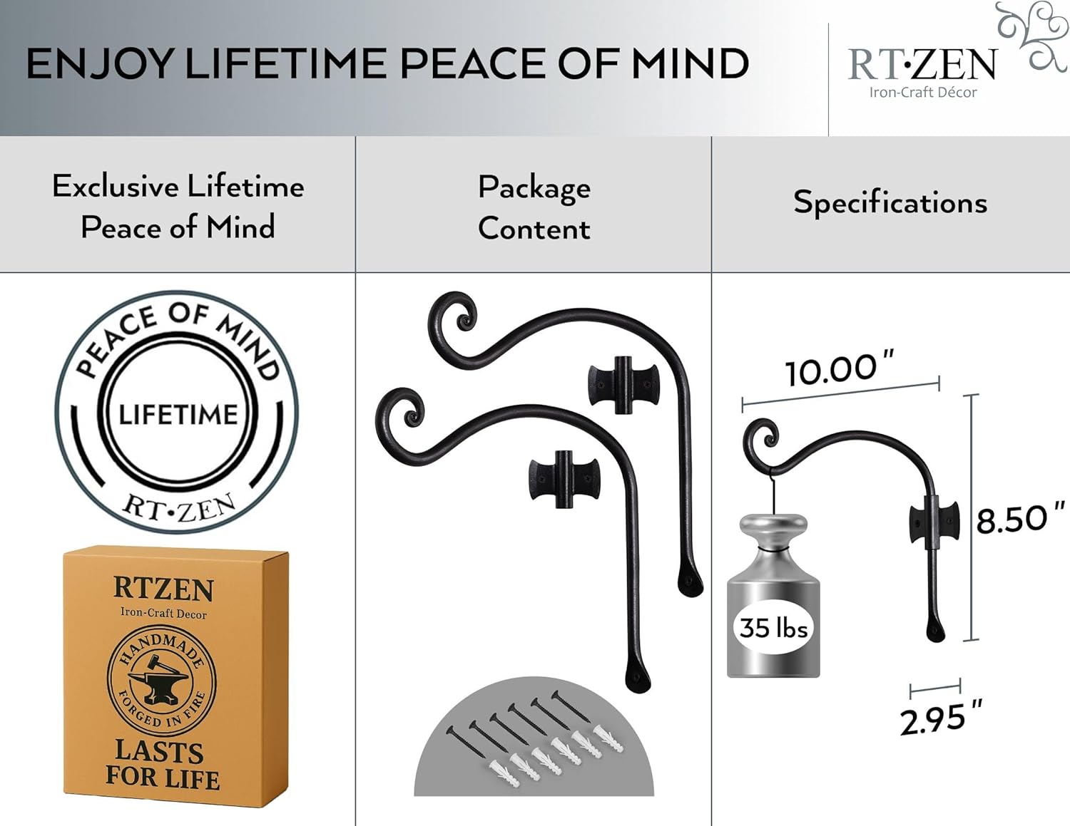 RTZEN Plant Hangers Outdoor or Indoor - Wrought Iron Metal Hanger Indoor Hook - Heavy Duty Wall Bracket Hooks for Hanging Plants Baskets Lanterns Wind Chimes - 2 Pack (Black Axe-Shape Hooks)