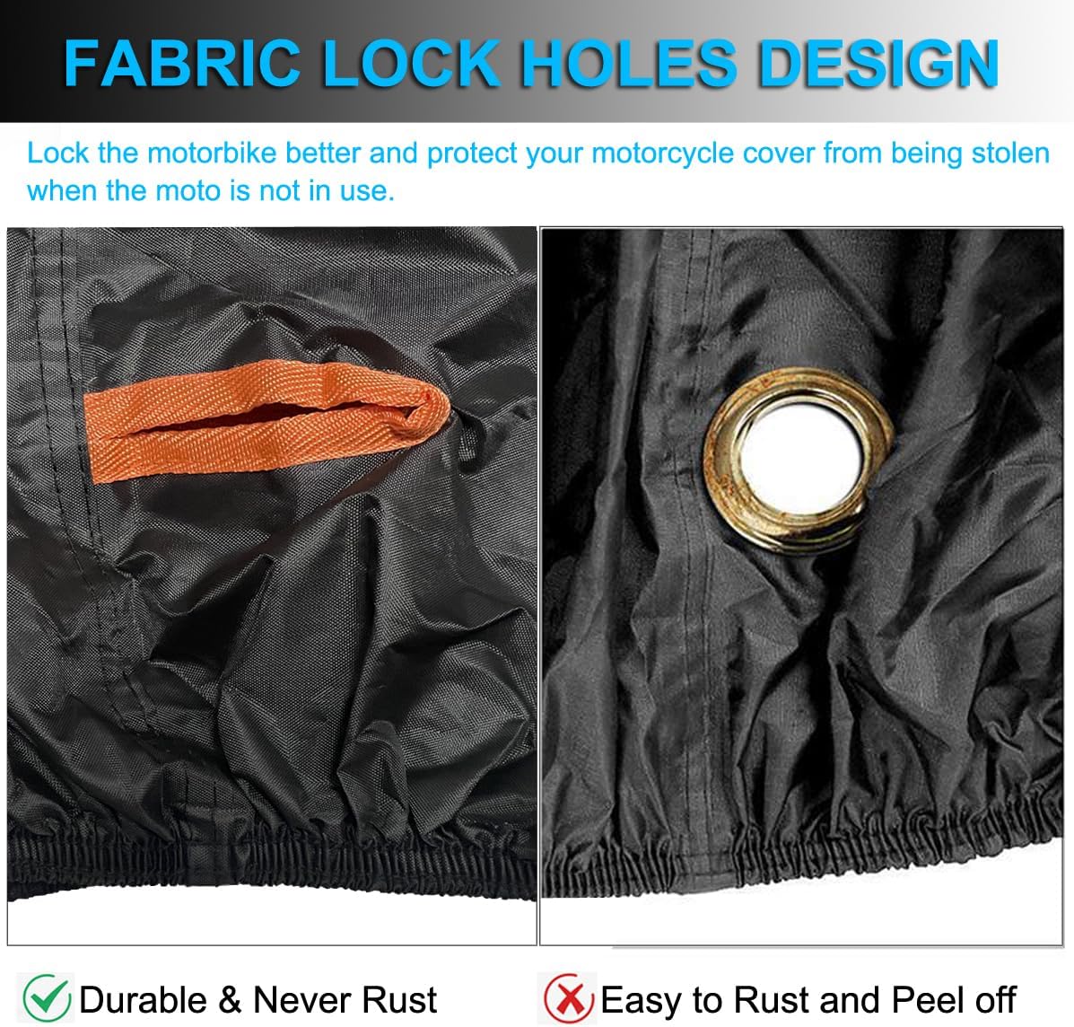- ăAnti-theft Lock Holesă Designed with 2 lock holes (front and rearïŒis helpful to lock the motorbike better and protect your motorcycle cover from being stolen. Compared with the metal lock hole, ours is never rust and peeling, perfect for motorcycle outdoor storage.