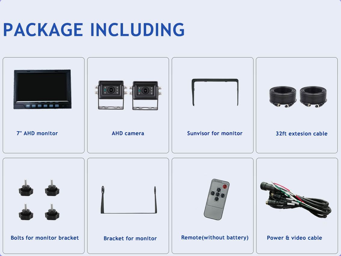 - 【APPLICATIONS】This is an upgraded industrial grade ahd 1080P wired 2-camera system. For its high vibration resisance ability of 10G and wide power input range DC12-24V, it is suitable for large vehicles, such as buses, box trucks, pickup trucks, garbage trucks, flatbed trucks, dump trucks, street sweeper trucks, refrigerator trucks, motor homes, vans, skid steers, farm tractors, combines, cotton pickers, crop sprayers, bulldozers, snow plows, forklifts, excavators, heavy equipments,etc.