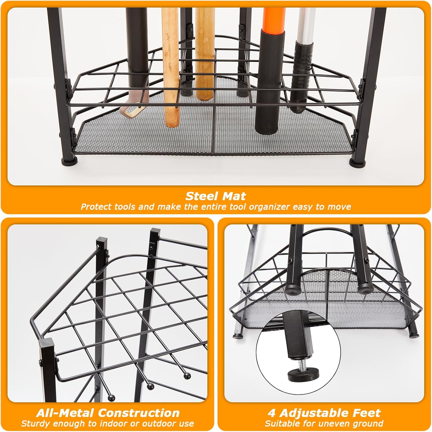 - Unique Triangular Design: The triangle yard tool organizer saves space by fitting perfectly into corners. It is very stable, solid and not shaking, not easy to collapse. Height-adjustable feet suitable for uneven ground. With steel mat to protect tools and make the entire tool rack easy to move
