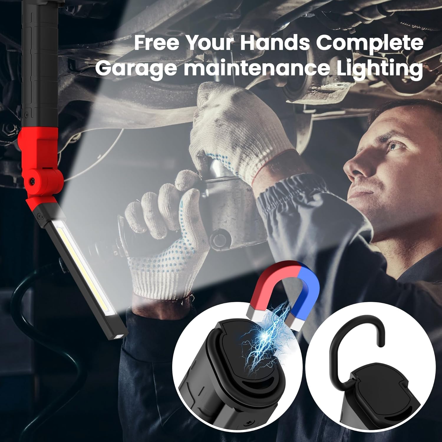- Magnetic Base & Hook: Strong magnet securely attaches the rechargeable work light to metal surfaces for hands-free use. The hook design makes it easy to hang the magnetic work light for mechanics, camping, or emergencies.
