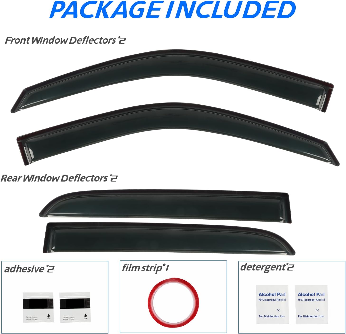 - ăPackage Includedă 4 pcs Vent Guards Shade Window Visors set - 2 pcs rear & 2 pcs front Vent Guards Visors, 2 pcs alcohol pad, 2 pcs adhesion promoter, a manual, a rool of spare double-sided tape