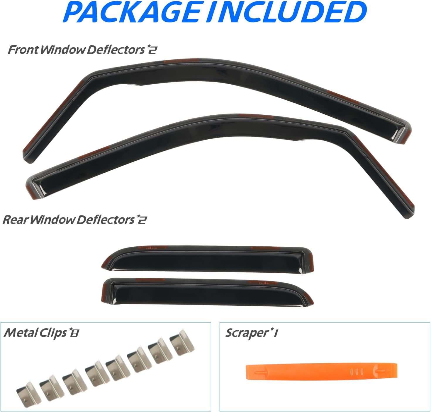 - ăEasy Installationă Come with 4 pcs FULL-SIZE side window deflectors, 8 pcs clips, 1 pcs plastic Crowbar for a durable and secure installation. No complicated instructions are needed. Attention: Please apply the clip to fix the rain guards