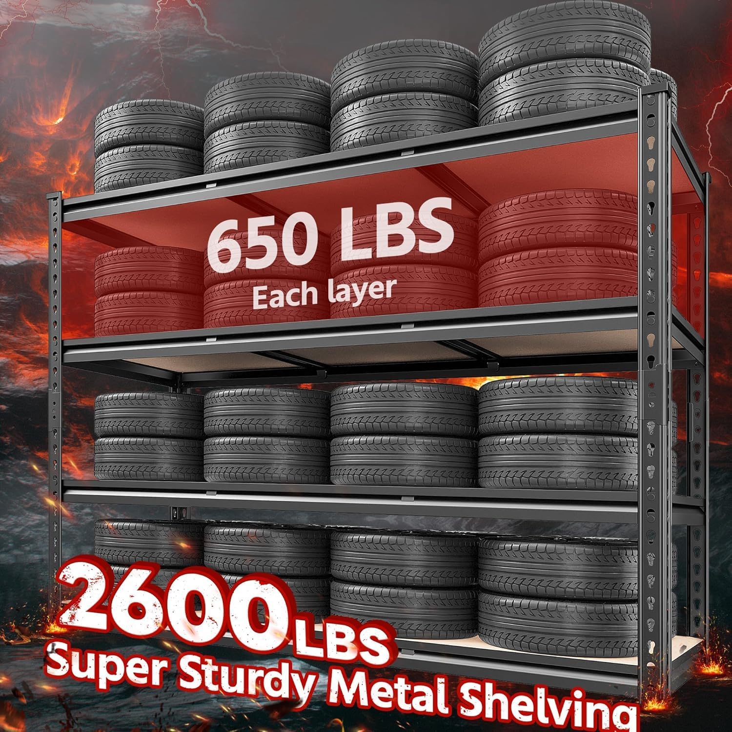 • 【2600LBS Capacity Garage Storage Shelves Heavy Duty】REIBII heavy duty garage shelving is constructed with reinforced steel legs and rolled-edge columns, featuring a high-quality metal frame combined with durable 7mm thickened MDF board. Each metal shelf, supported by beams underneath, has a weight capacity of up to 650 lbs, contributing to an overall bearing capacity of 2600 lbs. This design enhances the sturdiness of the garage shelves and enables efficient storage of numerous items.