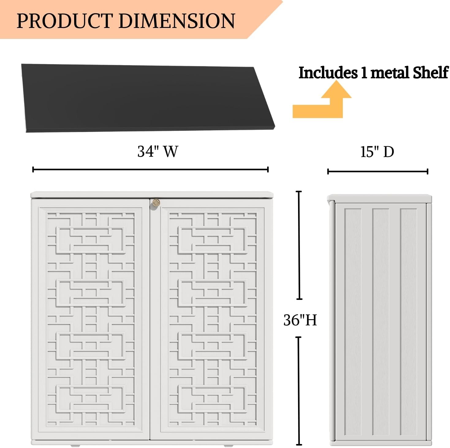 - Customizable Shelving: We supply only one shelf for free with the outdoor plastic cabinet, the shelving size is 33"L x10"W x 0.6"H