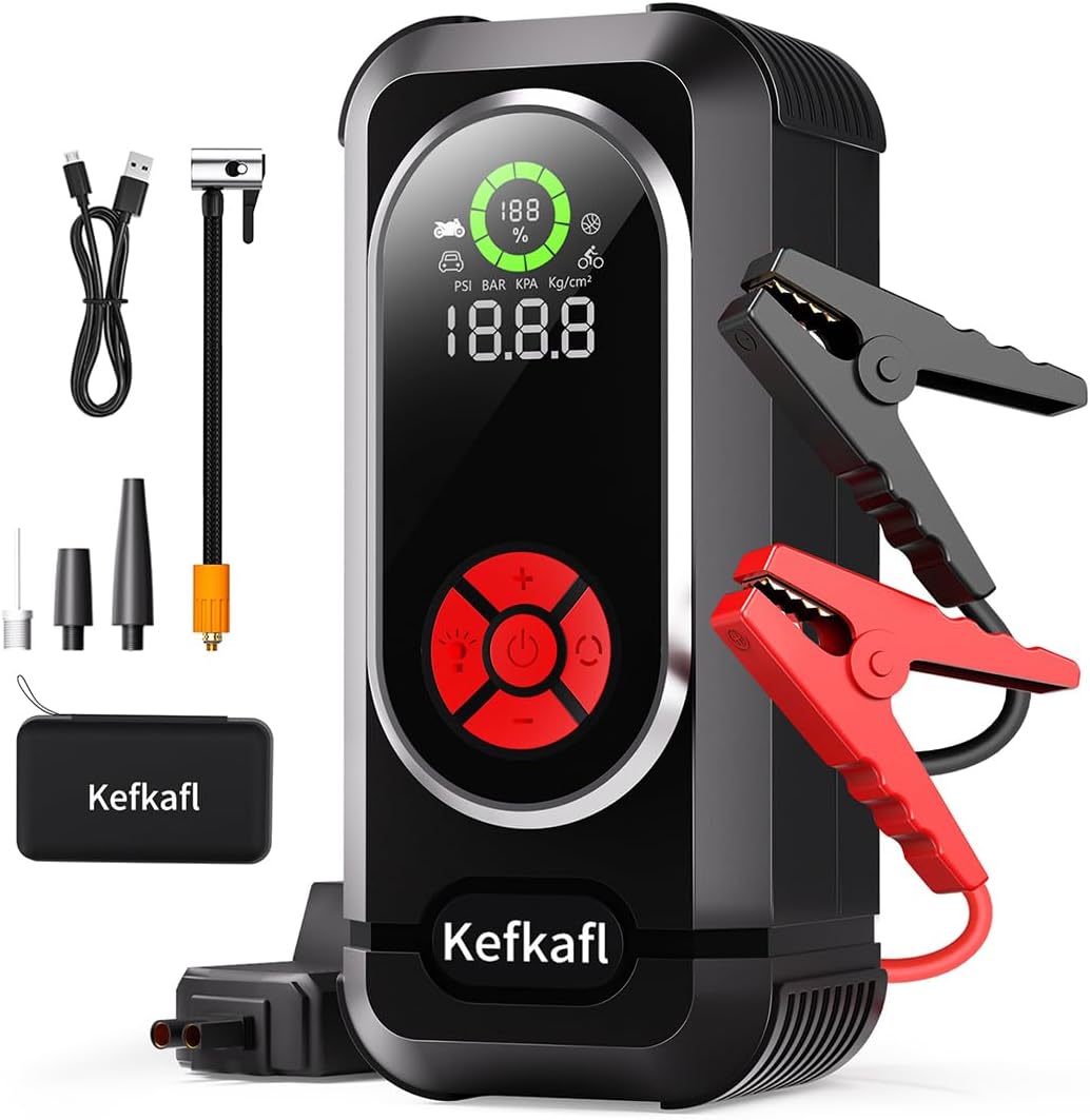 - â¤ă150PSI CORDLESS INFLATOR WITH SCREENăThe car jump starter with air compressor quickly inflates a car tire to 30 PSI in just 2 minutes, faster than most jump starter in the market. Equipped with 3 different nozzles & 4 selectable units (PSI, BAR, KPA, KG/cm²) for cars, bicycle, bikes, motorcycle, balls etc. The display screen can display the tire pressure and power in real time.