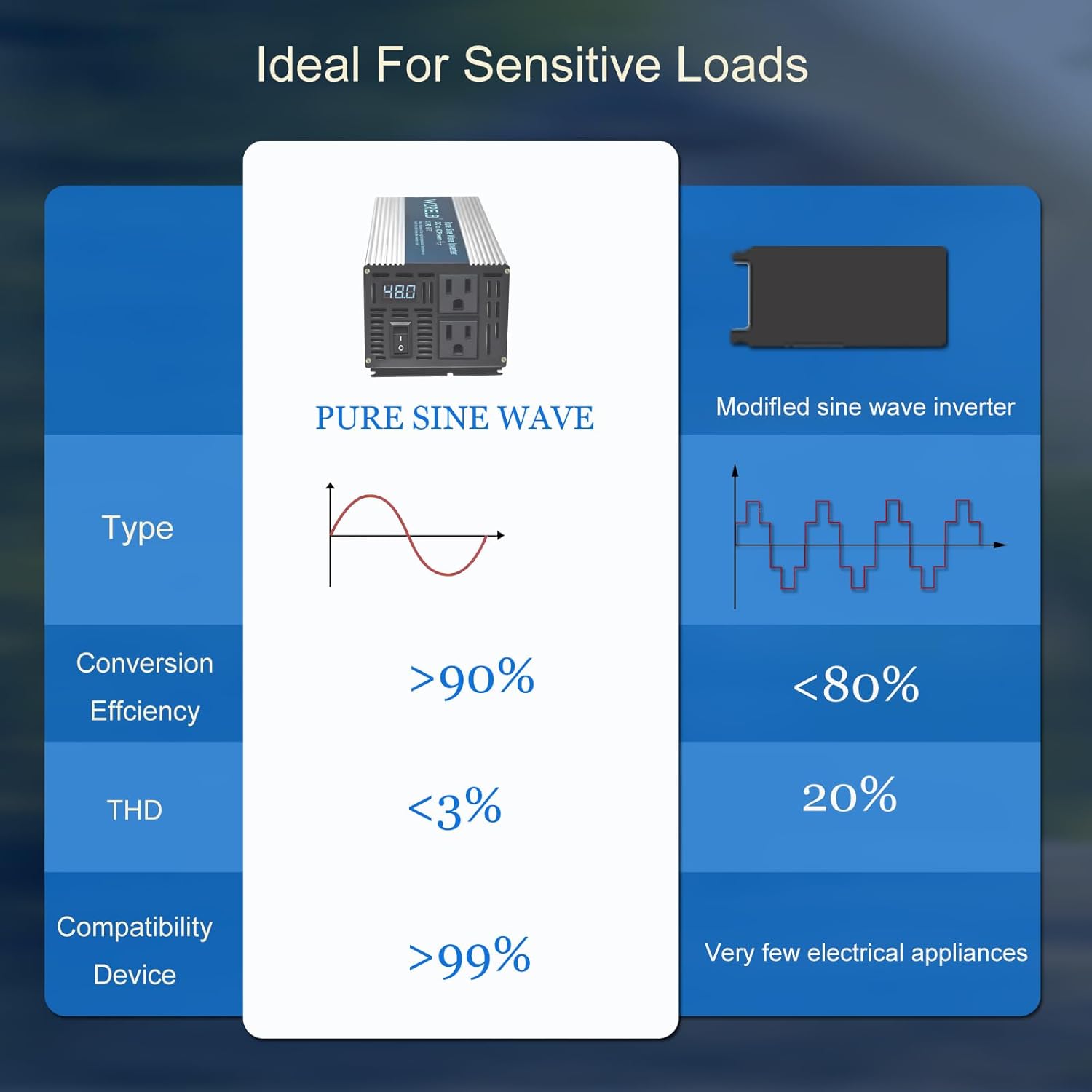 - 【Pure Sine Wave Power Inverter】High quality pure copper inductance, filter the wave form; imported mosfets with strong driving capacity, 1000 watt stable true pure sine wave AC output,2000W peak ,60Hz ,high frequency, with 2*120VAC outlets,8.33Amp Max, converts 24V DC to 110V 120V AC with FULL POWER OUT, suitable for the sensitive appliances.