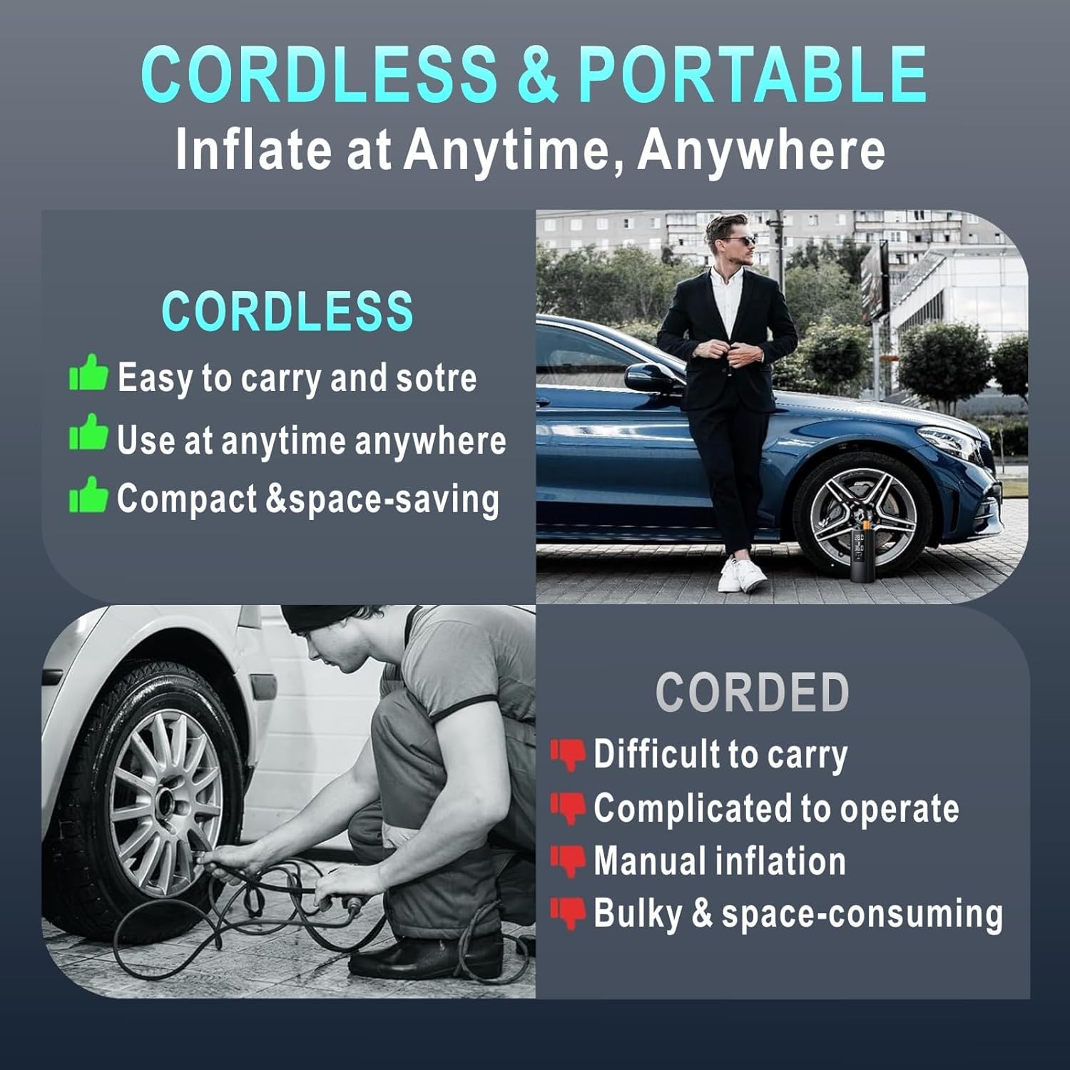 Tire Inflator Portable Air Compressor, 150 PSI & 3X Faster Cordless Air Pump for Car Tires, with Tire Pressure Gauge, LCD Dual Screen, Automatic Stop and LED Light, Bike Pump, for Motorcycle, Ball