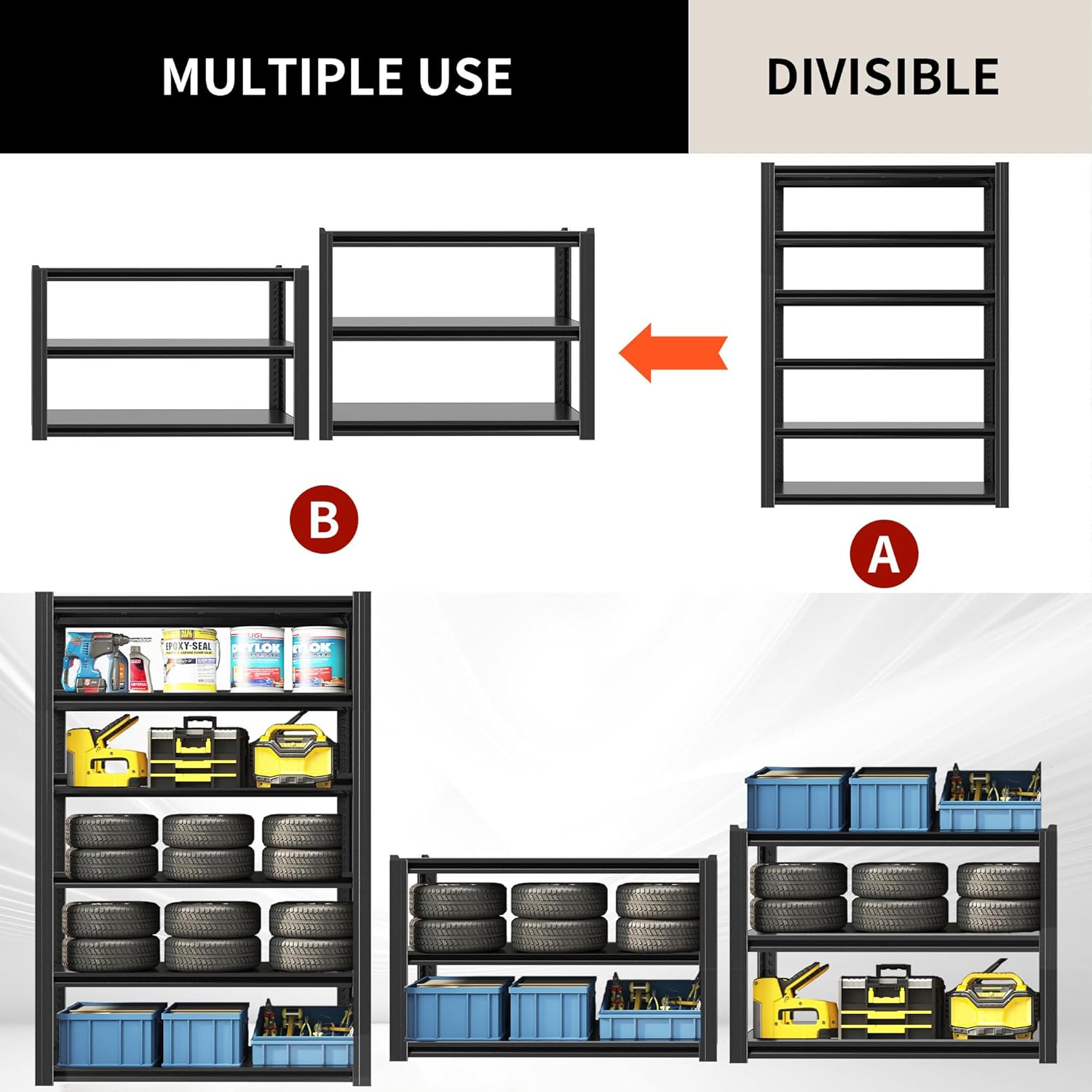 - ăHeavy-Duty CapacityăOur industrial garage shelving unit boasts a robust 2,500 lbs capacity, with each shelf supporting up to 500 lbs. Constructed from high-quality metal with reinforced double-layer legs, these multi-purpose garage storage shelves are designed to handle the toughest loads, making them ideal for garages, warehouses, and workshops.