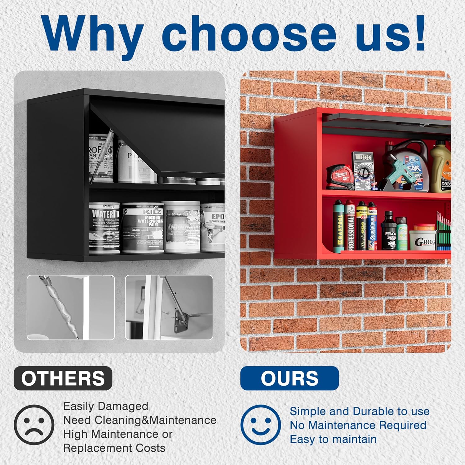 - Revolutionary Upgraded Opening and Closing System: Traditional left-right opening methods carry a risk of bumping heads. Our storage cabinets feature a unique top-bottom opening mechanism, where the entire door can be recessed into the cabinet itself, making full use of upper space and facilitating easy access to items stored inside.