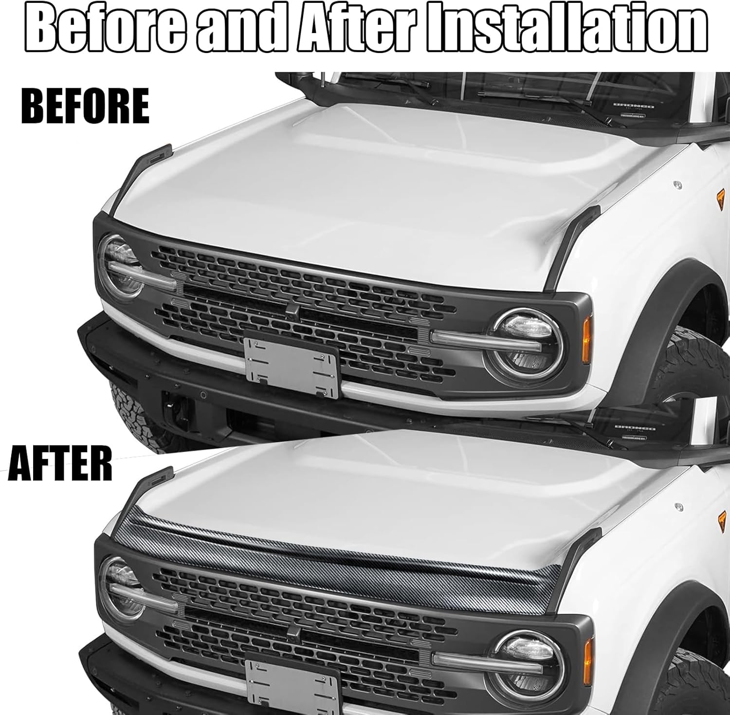 - No Drilling Required:The hood shield protector for Ford Bronco 2/4 with strong stickiness and is not easy to fall off.Just tear off the back of the tape and press it on the bronco.Only take some minutes.