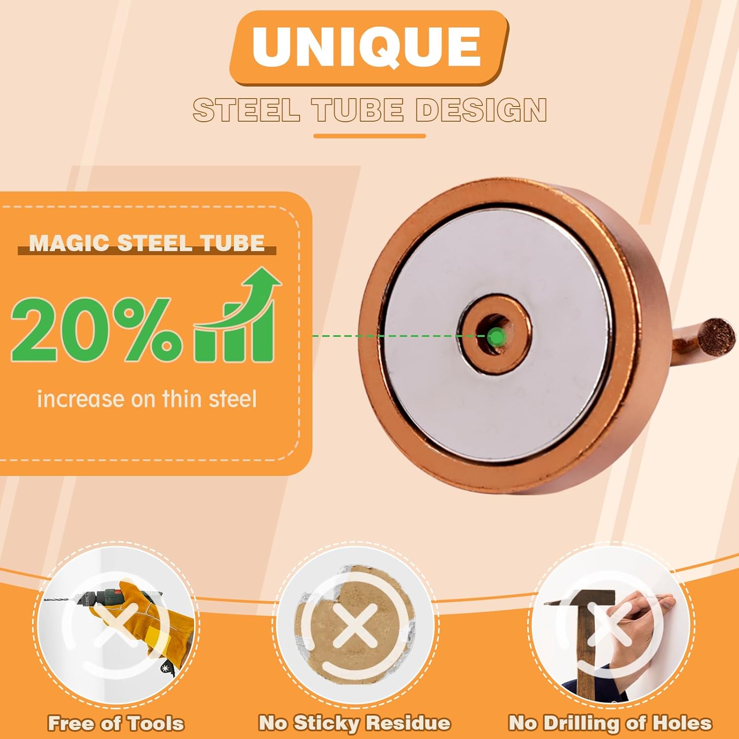 - ✔MAGIC STEEL TUBE DESIGN - Unique design of steel tube inside the base of magnetic hooks greatly increases the attractive force , especially on thin steel! It increase approximately 20% force comparing those none-tube magnets. it solves the problem of weak force on thin steel. Permanent magnetic hook with magic steel tube, strong magnetism lasts forever!