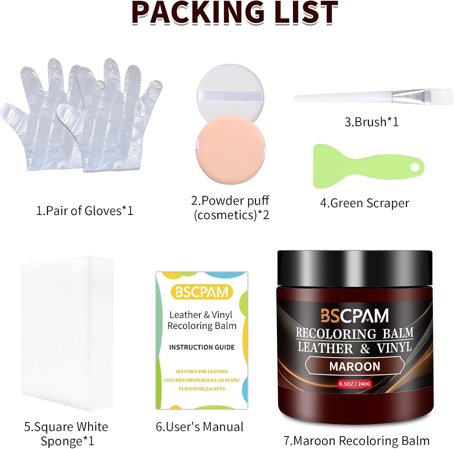 - Easy DIY Repairs: Leather repair kit includes, 1 Recoloring Balm + 1 Sponges + 2 Gloves + 2 Powder Puff + 1 Brush + 1 Putty Knife + User's Manual,meet any leather repair project