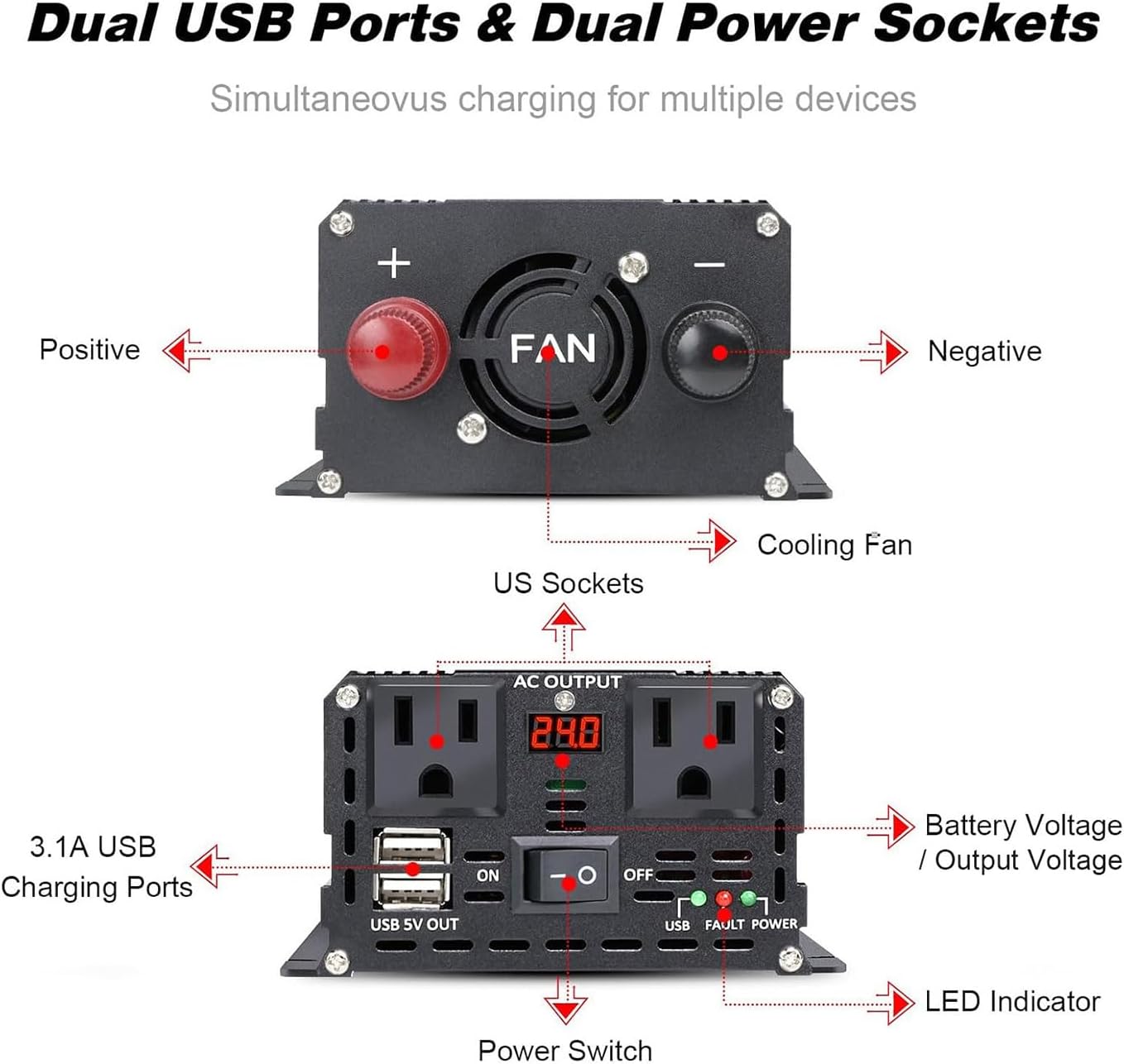 - HIGH QUALITY PURE SINE WAVE OUTPUT: LVYUAN Power Inverter provides continuous and stable 500W pure sine wave power, 1000W peak power with 2 AC outlets, 2 USB ports, easy to power multiple devices at the same time.